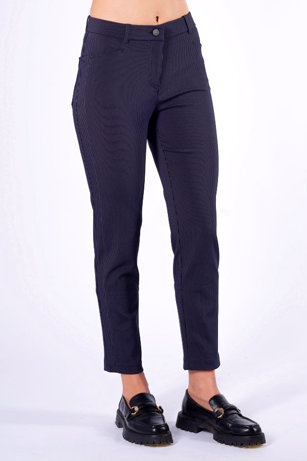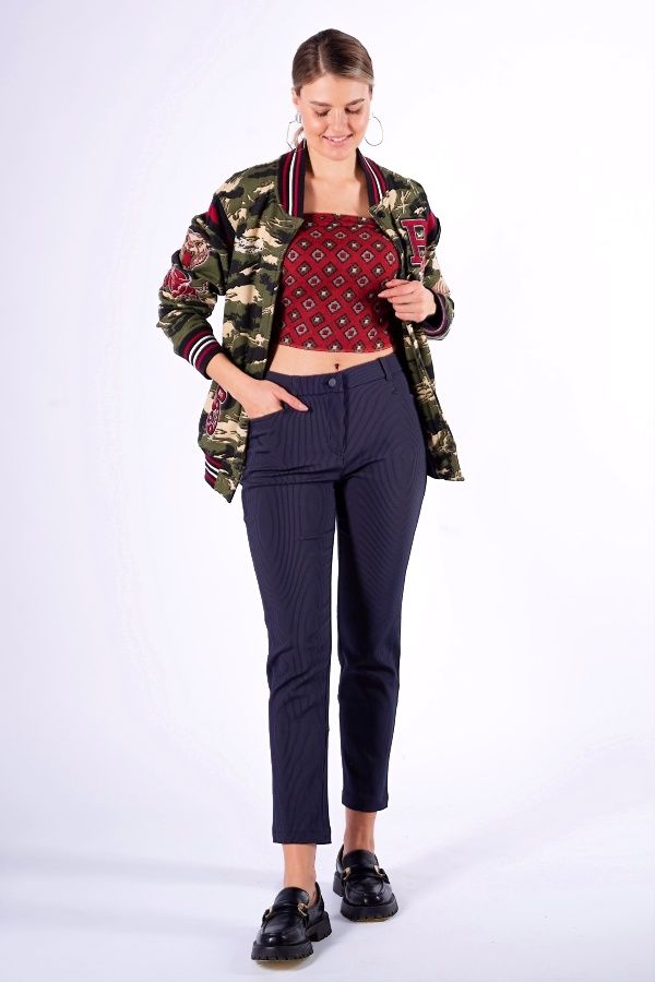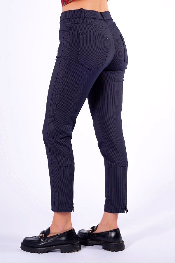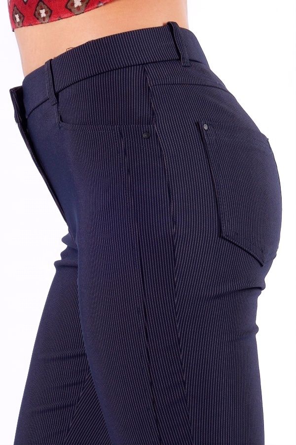 Модель в городском стиле. Детали: спереди застежка на молнию и фирменную пуговицу, боковые карманы, вертикальный рельеф, сзади под кокеткой накладные карманы, по задней половинке брюк ,от середины икры, втачной функциональный замок. Карманы декорированы хольнитенами.
