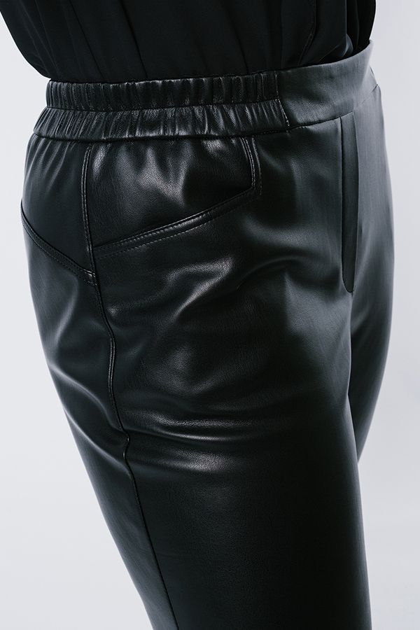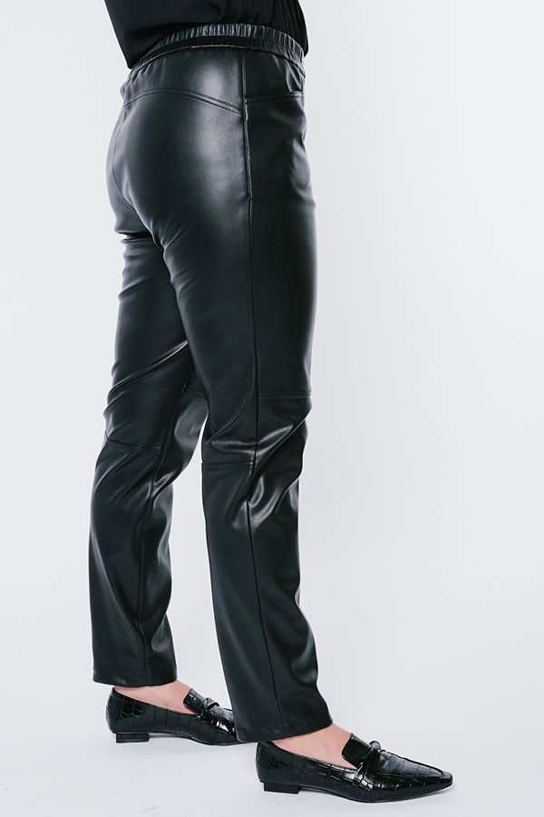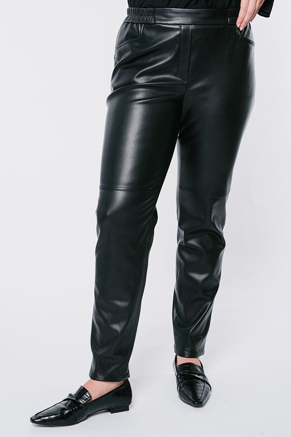Стильные брюки из экокожи в молодежном стиле. Силуэт прямой от колена, книзу заужен на 1,5 см, с имитацией гульфика, карманы с отрезным бочком прямоугольной формы. Пояс на резине. Сзади кокетка. По задней половине брюк горизонтальные резы ниже уровня колена, по передней половине- выше уровня колена. Отделка: двойными строчками, закрепки.