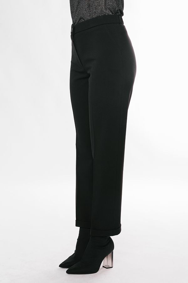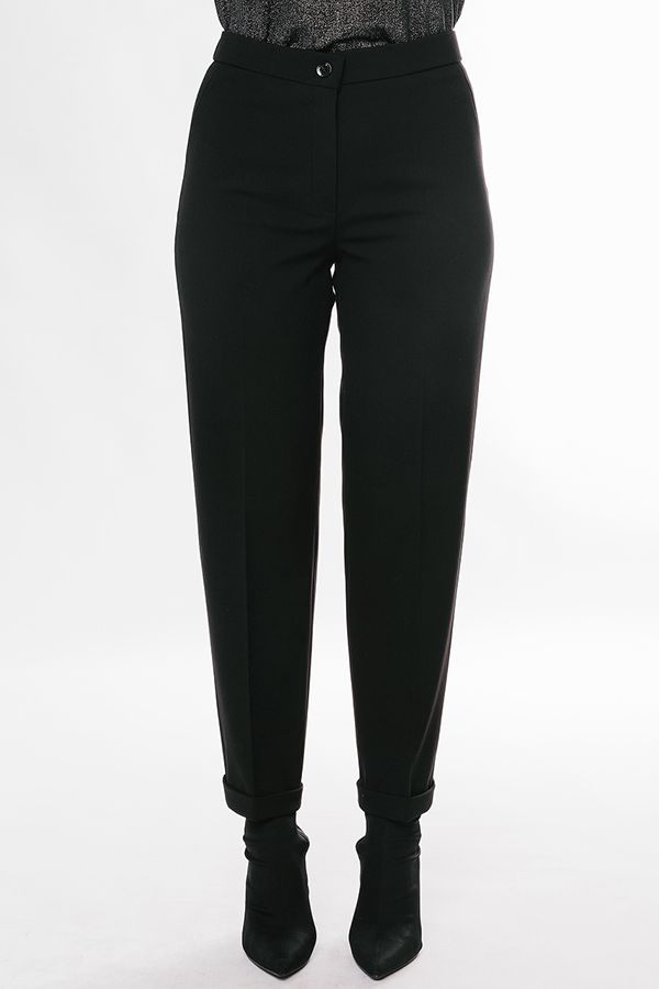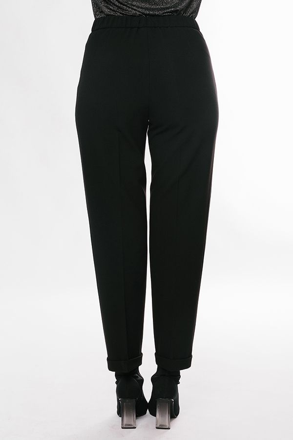 Брюки в классическом стиле со стрелкой. Детали: спереди застежка на молнию и пуговицу, сбоку имитация боковых карманов, сзади вытачки, по задней половинке, в поясе резина. По линии низа отворот. Длина по внутреннему шву - 74 см. Ширина низа - 18 см. *Числовые параметры соответствуют размеру 44. Размер модели на фото: 46. Параметры модели: 86-64-100. Рост модели на фото: 174 см.