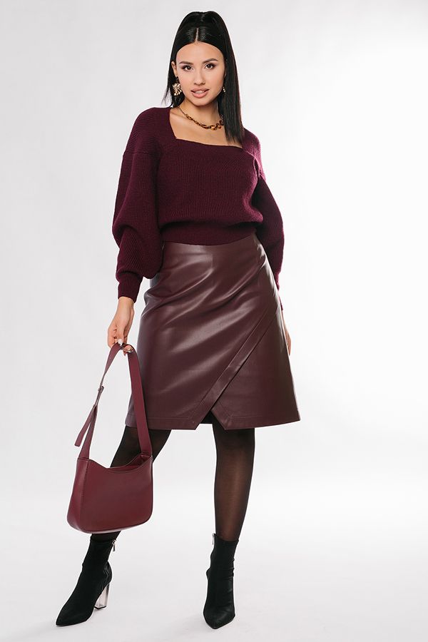 Юбка классического кроя из бордовой эко-кожи. По переду изделия имитация запаха, вытачки. По спинки изделия вытачки, в среднем шве молния. ВНИМАНИЕ! Изделие нельзя стирать! Длина изделия 59 см. Числовые параметры соответствуют размеру 42. Размер модели на фото: 46. Параметры модели: 86-64-100. Рост модели на фото: 174 см.