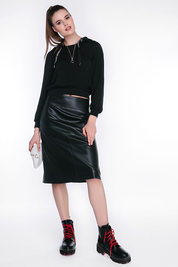 Молодежная модель юбки А-силуэта из популяпной эко-кожи черного цвета на подкладке. Юбка выполнена без пояса, на фигурной кокетке, сзади металлическая молния. Длина 66 см. Размер модели на фото : 42,. Параметры модели: 86-63-94. Рост модели на фото: 173 см.