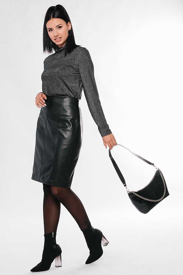 Юбка прямого кроя из эко-кожи черного цвета с рельефными отстрочками по передней и задней полочке. Застёжка, выполенная в виде металлической молнии, расположена сзади, в среднем шве. На спинке также имеется классическая шлица, благодаря которой юбка не будет сковывать ваших движений во время ходьбы. Длина изделия 61 см. Числовые параметры соответствуют размеру 44. Размер модели на фото: 46. Параметры модели: 86-64-100. Рост модели на фото: 174 см.