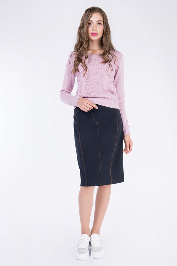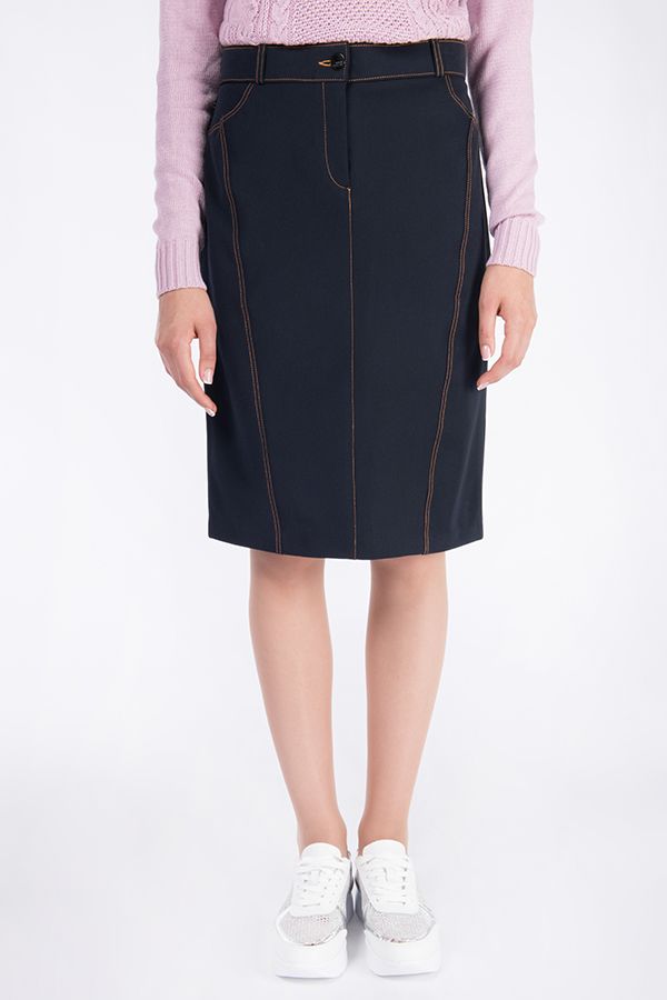 Юбка в джинсовом стиле, до середины колена, чуть приуженная, с рельефными отстрочками СИНЕГО цвета по передней и задней половинке. Спереди имитация карманов, гульфик, сзади кокетка, разрез. Притачной пояс, шлевки. Длина изделия - 59 см. Размер модели на фото: 42 Параметры модели: 97-62-91 Рост модели на фото: 175