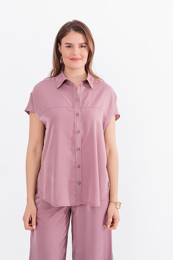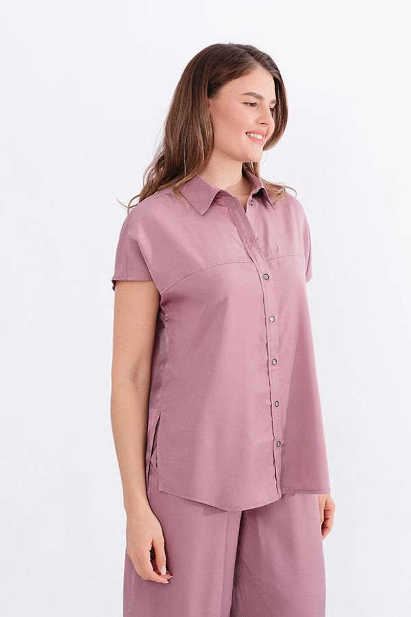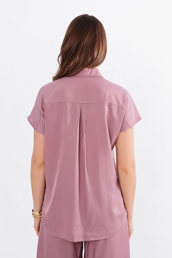 Блузка из тонкой вискозной ткани. Застежка на пуговицы, по передней половинке кокетка. По спинке кокетка со встречной складкой. Длина по спинке 69 см. *Числовые параметры соответствуют размеру 46. Размер модели на фото: 44.  Параметры модели: 86-63-94. Рост модели на фото: 173 см.