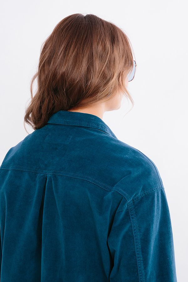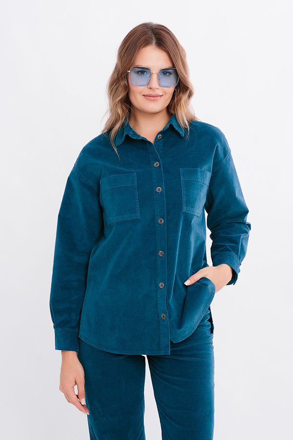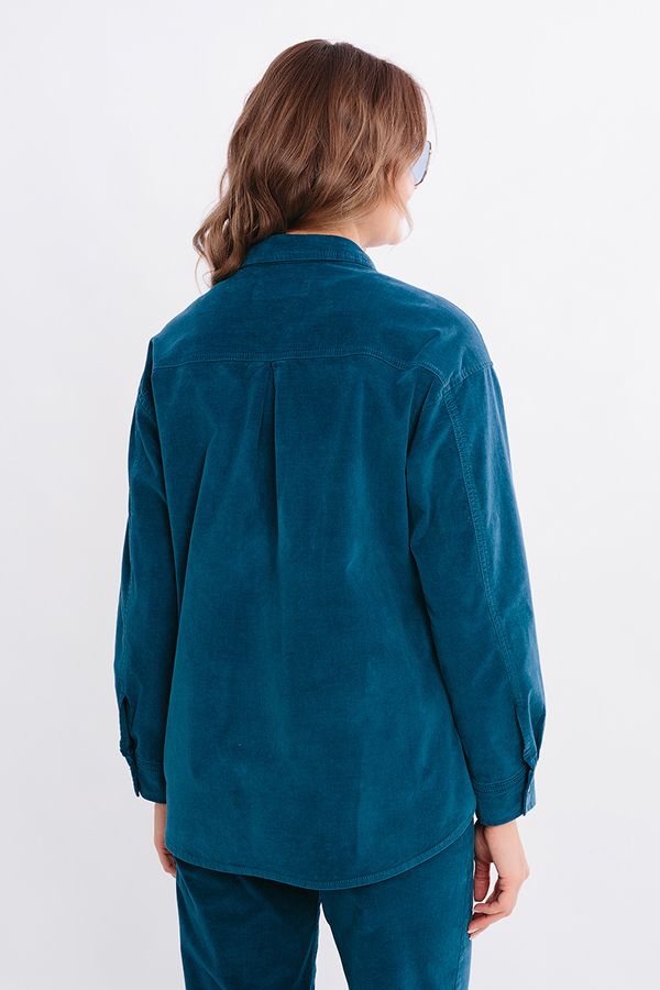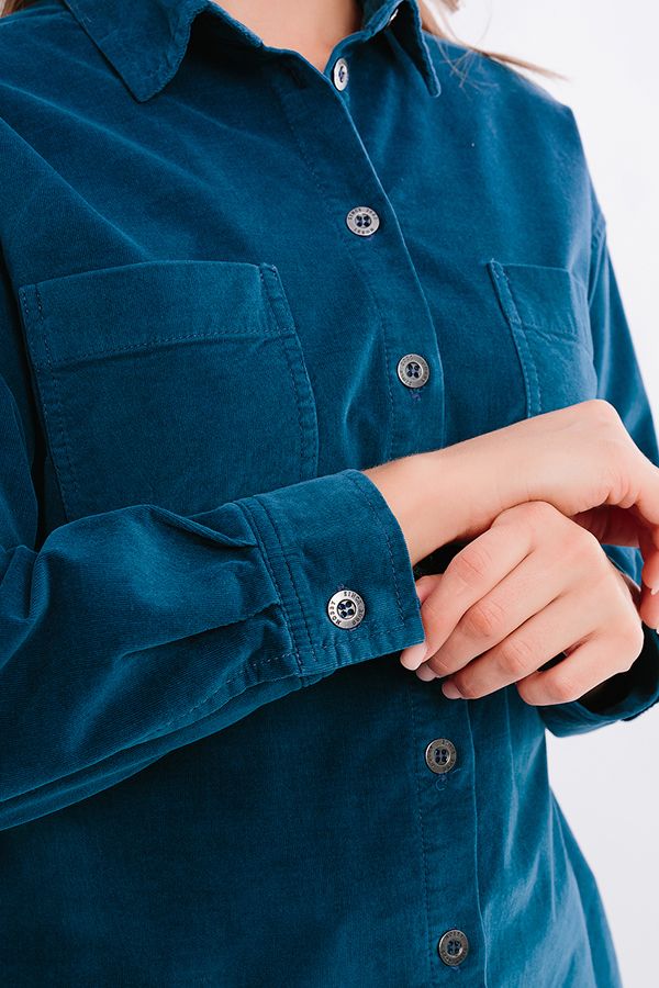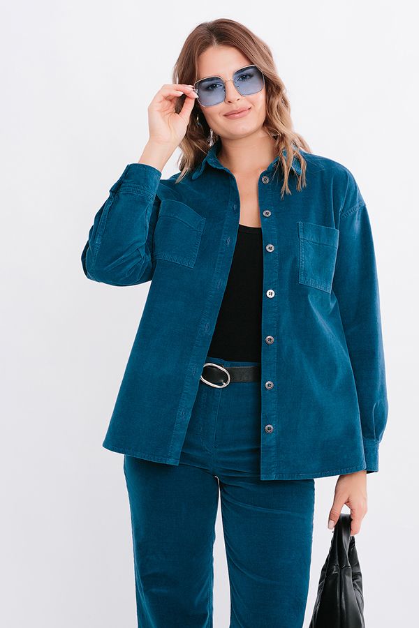Классическая рубашка свободного силуэта из микровельвета. Детали: спереди застежка на пуговицы, накладные карманы, по спинке кокетка. Длина по спинке 70 см. *Числовые параметры соответствуют размеру 44. Размер модели на фото: 44. 86-63-94. Рост модели на фото: 173 см.