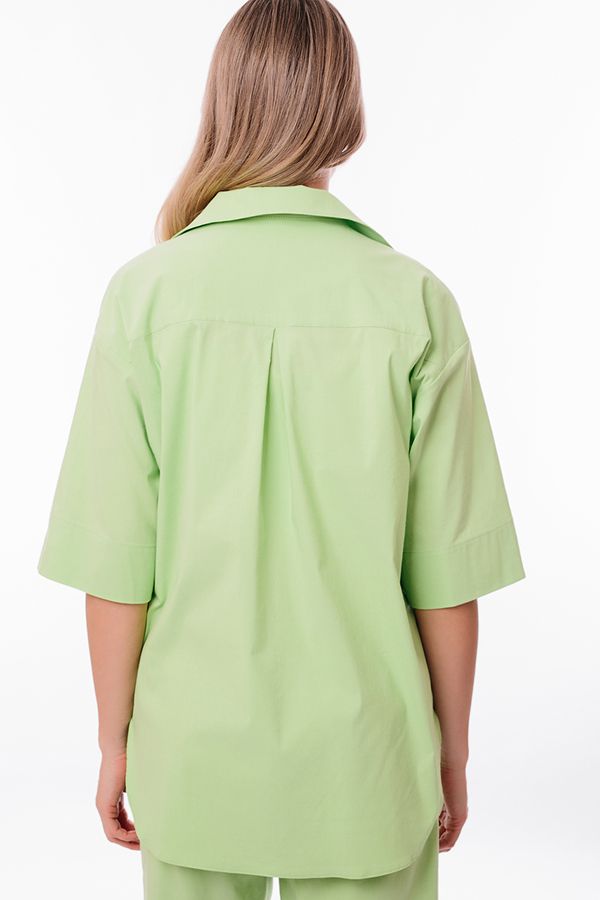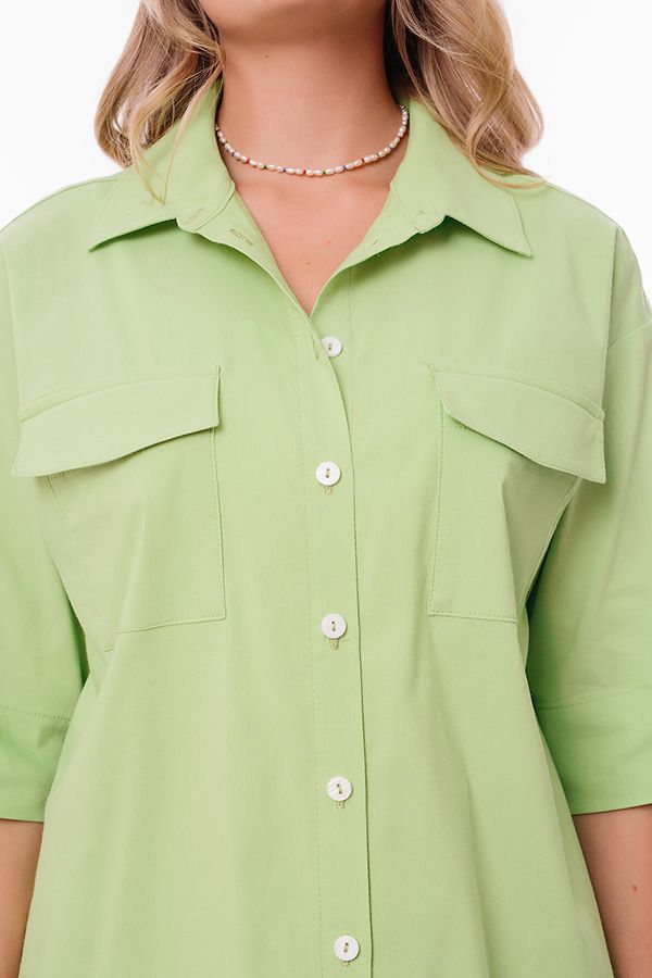 Рубашка свободного силуэта. Детали: спереди застежка на пуговицы, накладные карманы с клапаном, по спинке кокетка. Длина по спинке 73 см. Размер модели на фото: 44. 86-63-94. Рост модели на фото: 173 см.