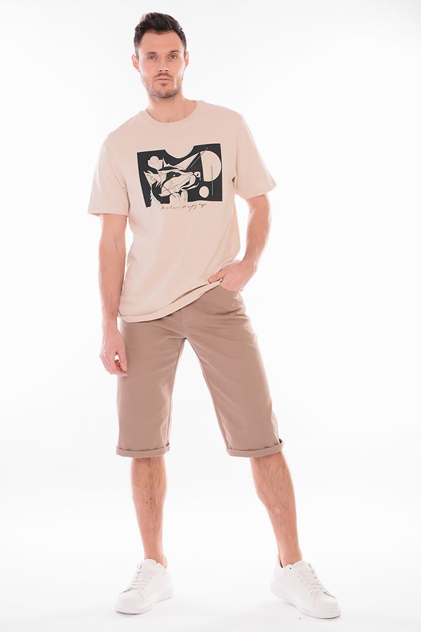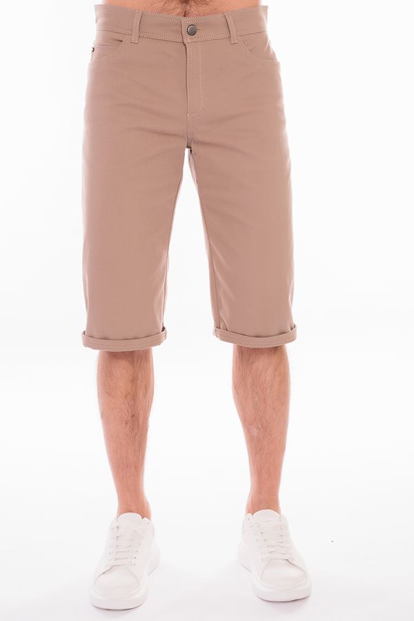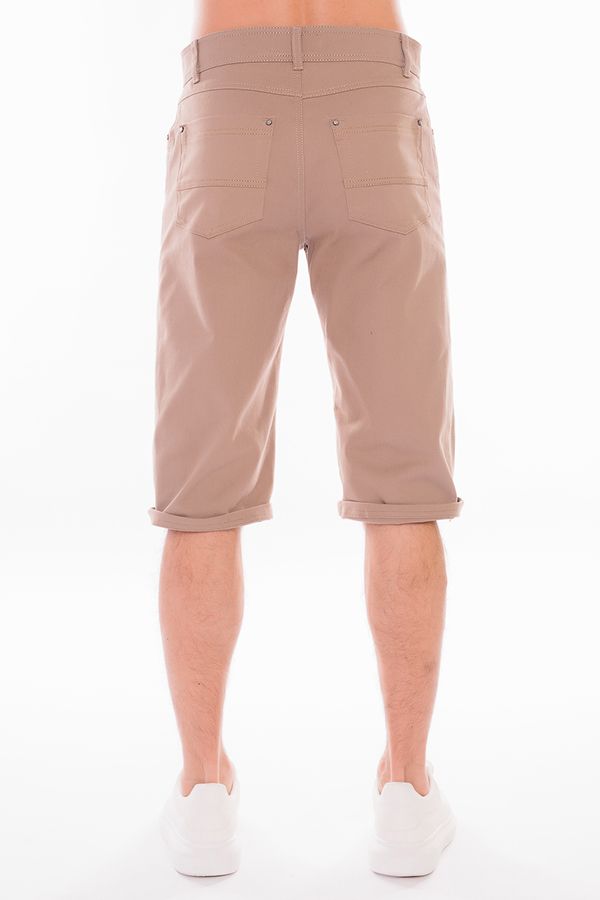 Мужские бермуды "5 карманов" из темно-бежевого денима. Детали: спереди застежка на молнию и пуговицу(болт), боковые карманы, карман для мелочи, сзади под кокеткой накладные карманы, на поясе шлевки. Карманы закреплены хольнитенами. Длина по внутреннему шву - 41 см. Ширина по линии низа - 25 см. *Числовые параметры соответствуют размеру 46. Размер модели на фото: 48. Параметры модели: 100-78-105. Рост модели на фото: 181 см.