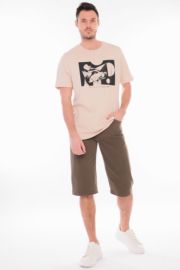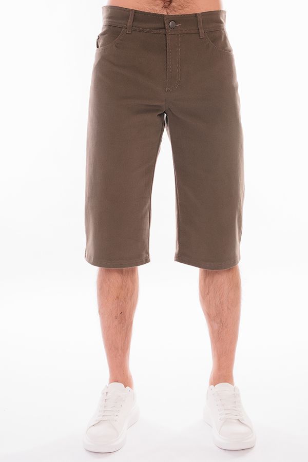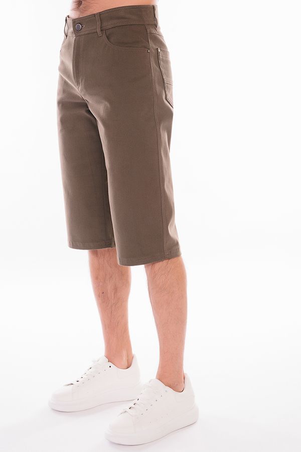 Мужские бермуды "5 карманов" из денима цвета хаки. Детали: спереди застежка на молнию и пуговицу(болт), боковые карманы, карман для мелочи, сзади под кокеткой накладные карманы, на поясе шлевки. Карманы закреплены хольнитенами. Длина по внутреннему шву - 41 см. Ширина по линии низа - 25 см. *Числовые параметры соответствуют размеру 48. Размер модели на фото: 48. Параметры модели: 100-78-105. Рост модели на фото: 181 см.