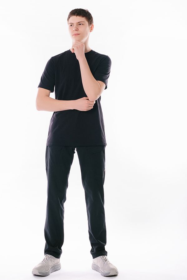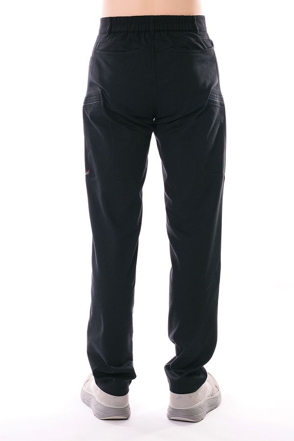 Молодежные мужские брюки слегка приуженного кроя из ткани с большим содержанием хлопка. Детали: спереди застежка на молнию и пуговицу, боковые карманы с горизонтальном входом с хольгитенами, с правой сторны, карман для мелочи. Сзади, под кокеткой, прорезные карманы оригинального кроя. По бокам, оригинальные сдвоенные карманы на молнии и клапане. По спинке изделия, в поясе резина на сборке. На поясе шлевки. Длина по внутреннему шву: 85 см. Ширина низа: 19.5 см. Числовые параметры соответствуют размеру 50. Размер модели на фото: 46.