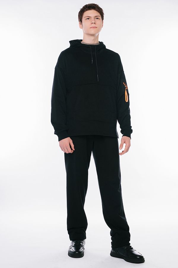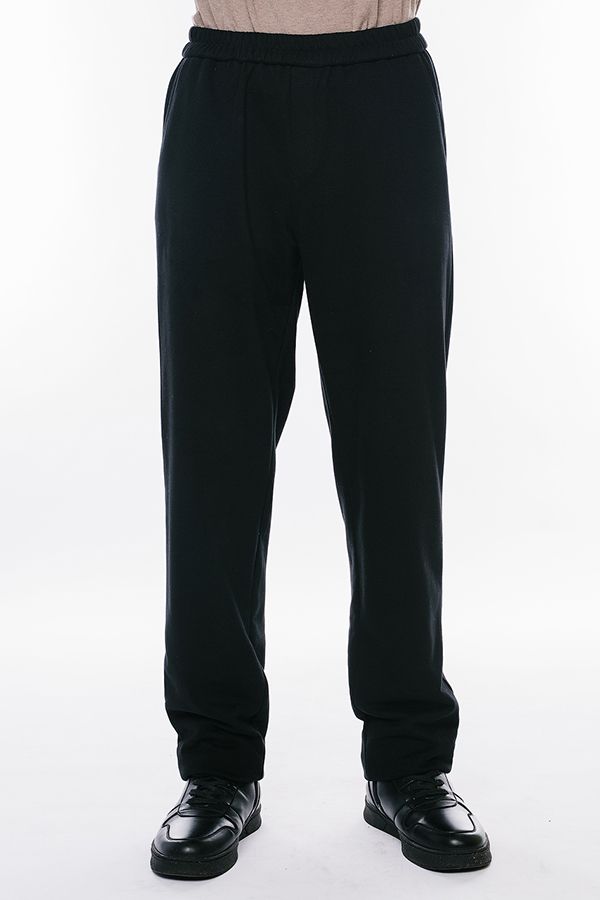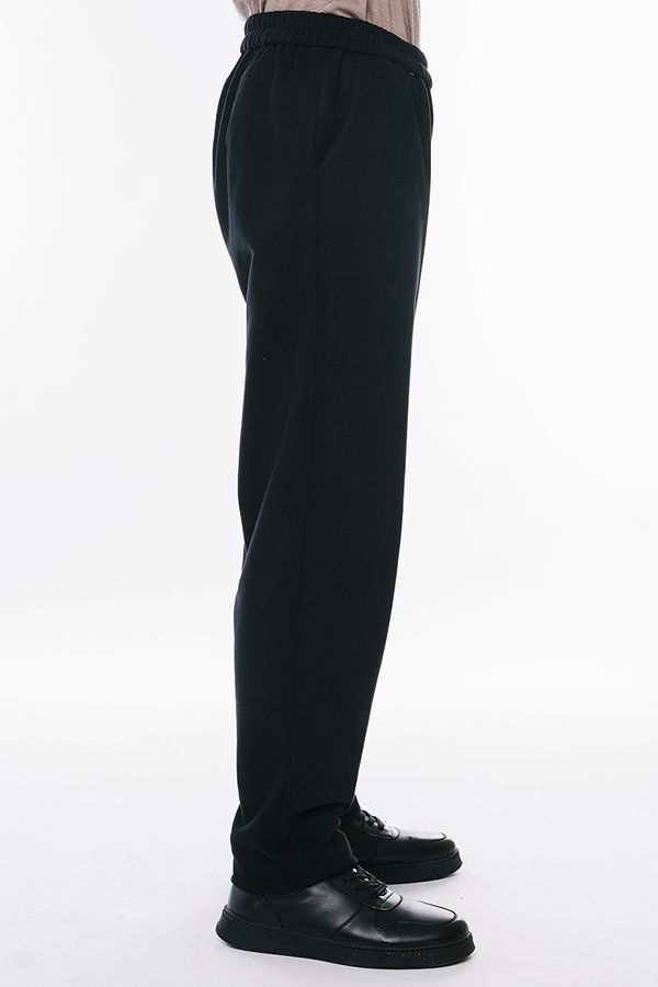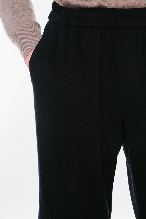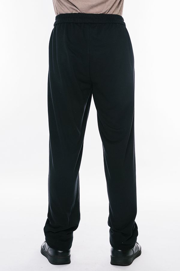 Мужские брюки из черного футера трехнитки. Пояс на резине, боковые карманы с отрезным бочком.Имитация гульфика. Длина по внутреннему шву - 88 см. Ширина низа - 19.5 см. *Числовые параметры соответствуют размеру 52. Размер модели на фото: 50. Рост модели на фото: 183 см.