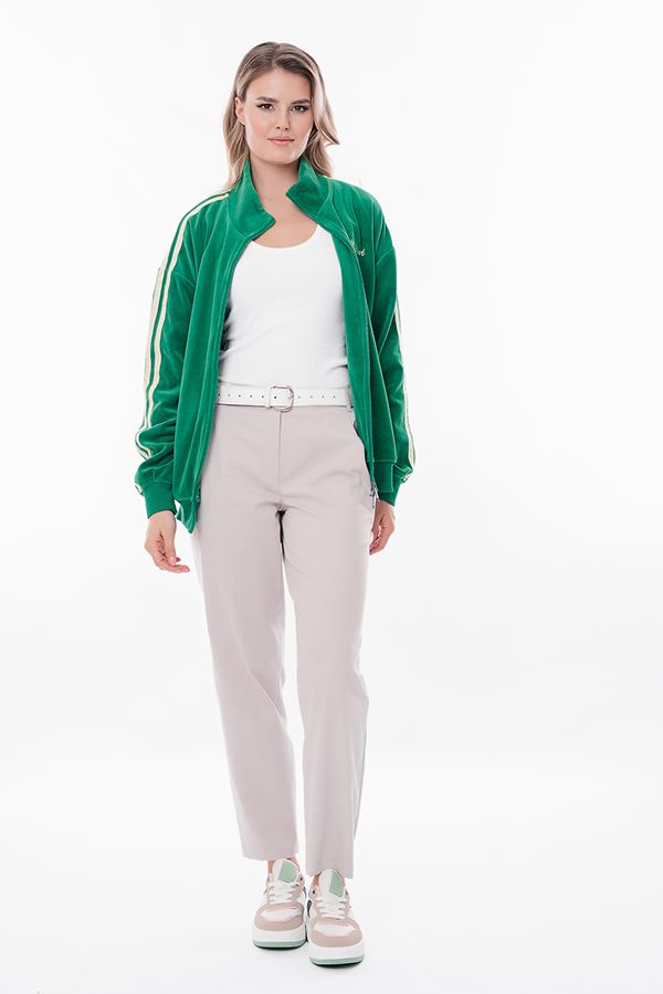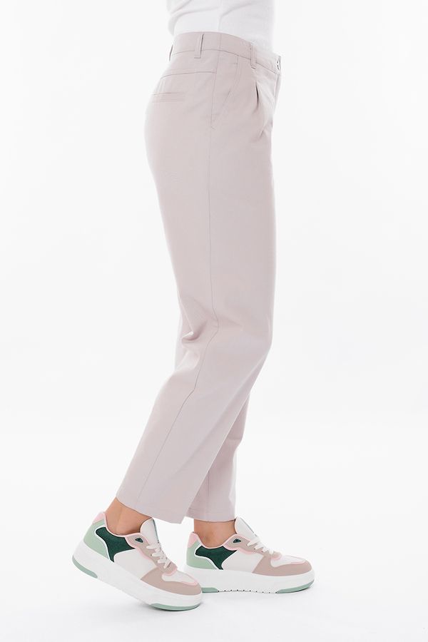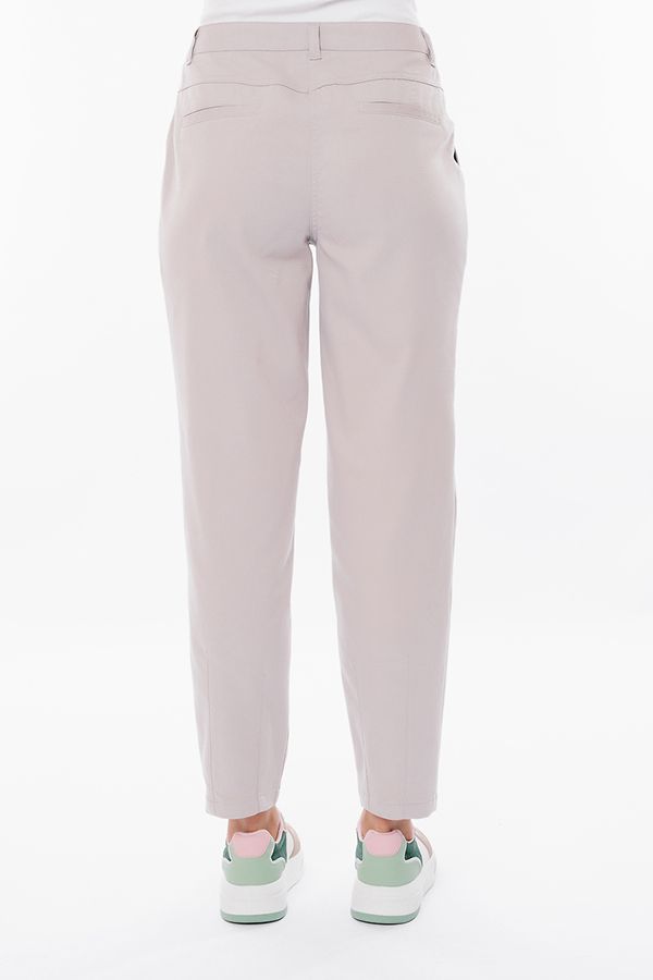 Молодежные брюки-бананы из ткани с большим содержанием хлопка. Детали: спереди застежка на молнию и пуговицу, боковые карманы с отрезным бочком, по линии пояса защипы, сзади под кокеткой накладные карманы с хольнитенами. На поясе шлевки. По линии низа брюк оригинальная отделка - две вертикальные вытачки. Длина по внутреннему шву - 72,5 см. Ширина по линии низа -  16,5 см. *Числовые параметры соответствуют размеру 42. Размер модели на фото: 42. Параметры модели: 86-63-94. Рост модели на фото: 173 см.