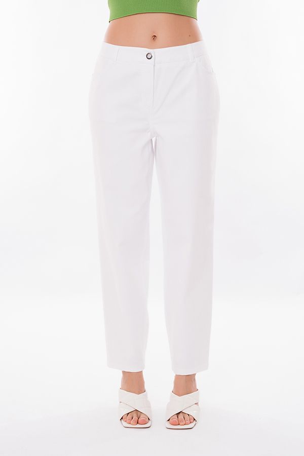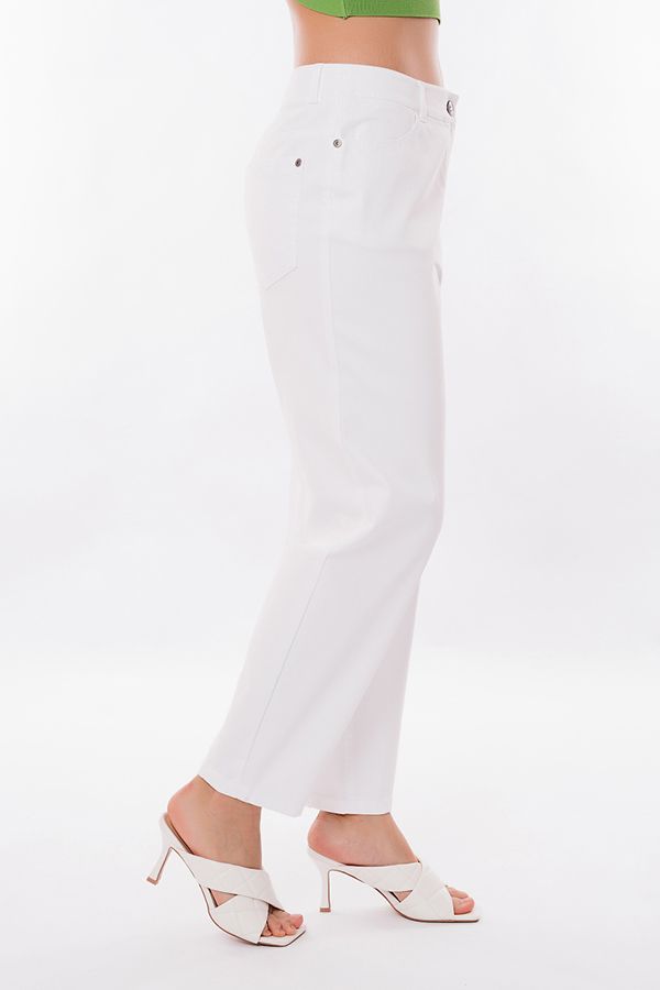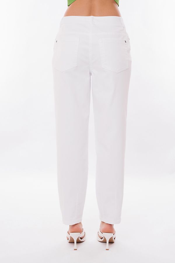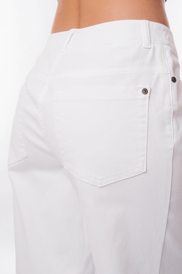 Молодежные джинсы-бананы белого цвета. Детали: спереди застежка на молнию и пуговицу, боковые карманы с горизонтальным входом с хольнитенами, сзади под кокеткой накладные карманы с хольнитенами. На поясе шлевки. По линии низа брюк оригинальная отделка - две вертикальные вытачки. Длина по внутреннему шву - 70 см. Ширина по линии низа - 16 см. *Числовые параметры соответствуют размеру 44. Размер модели на фото: 44. Параметры модели: 86-63-94. Рост модели на фото: 173 см.