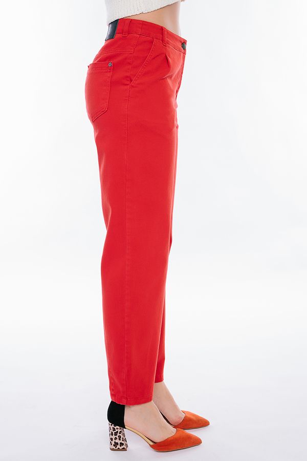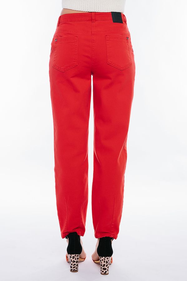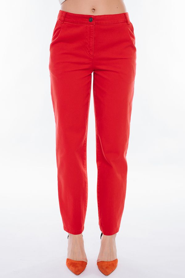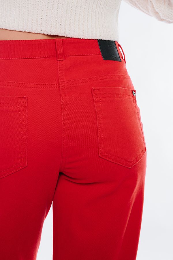 Молодежные джинсы-бананы сочного красного цвета. Детали: спереди застежка на молнию и пуговицу, боковые карманы с отрезным бочком, по линии пояса защипы, сзади под кокеткой накладные карманы с хольнитенами. На поясе шлевки. По линии низа брюк оригинальная отделка - две вертикальные вытачки. Длина по внутреннему шву - 70,5 см. Ширина по линии низа - 16 см. *Числовые параметры соответствуют размеру 42. Размер модели на фото: 42. Параметры модели: 86-63-94. Рост модели на фото: 173 см.