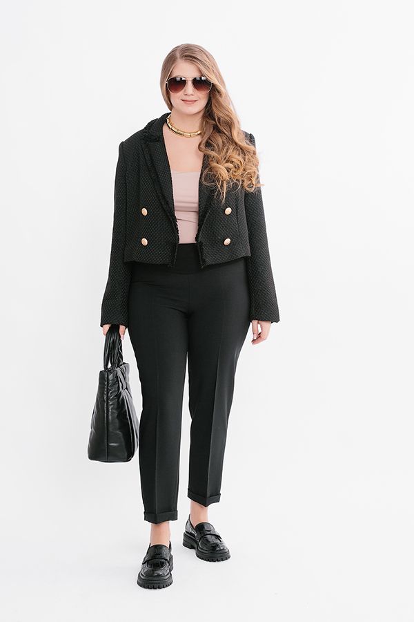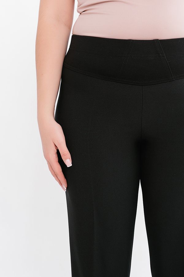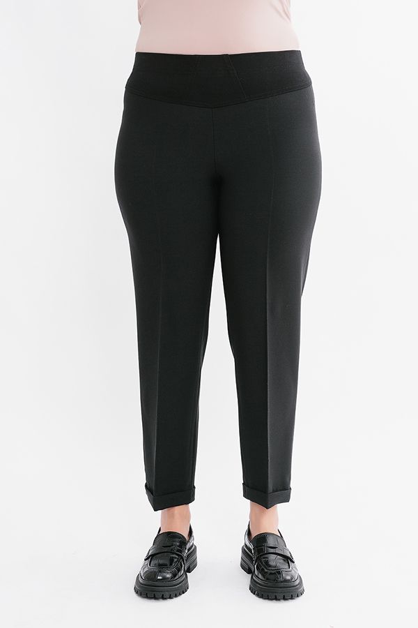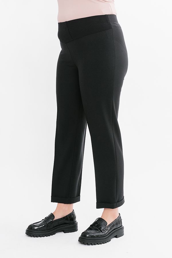 Брюки в городском стиле. Модель без застежки на поясе из эластичной ткани. По линии низа отворот, который можно использовать для изменения длины брюк. Длина брюк по внутреннему шву- 71 см. Ширина низа- 19 см. * Числовые параметры соответствуют размеру 46. Размер модели на фото: 52. Параметры модели: 100-82-133. Рост модели на фото: 170 см.