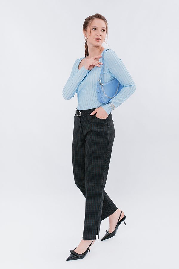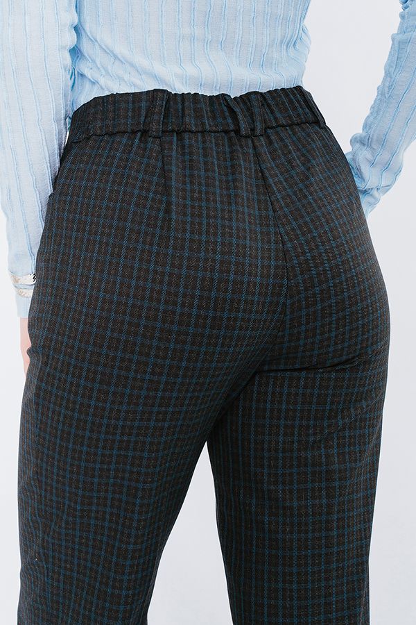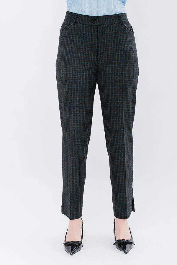 Комфортная модель брюк из черной ткани в клетку. Силуэт слегка зауженный. Детали: Спереди застежка на молнию и пуговицу, карманы с горизонтальным входом, с отделкой из эко-кожи. По спинке вытачки, в поясе резина на сборке, на поясе шлевки. В боковых швах разрез (14 см). Длина по внутреннему шву - 75 см. Ширина низа - 19 см. Числовые параметры соответствуют размеру 44. Размер модели на фото: 44. Параметры модели: 94-62-100. Рост модели на фото: 175 см.