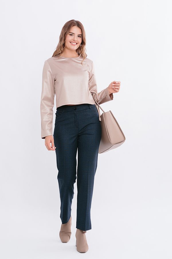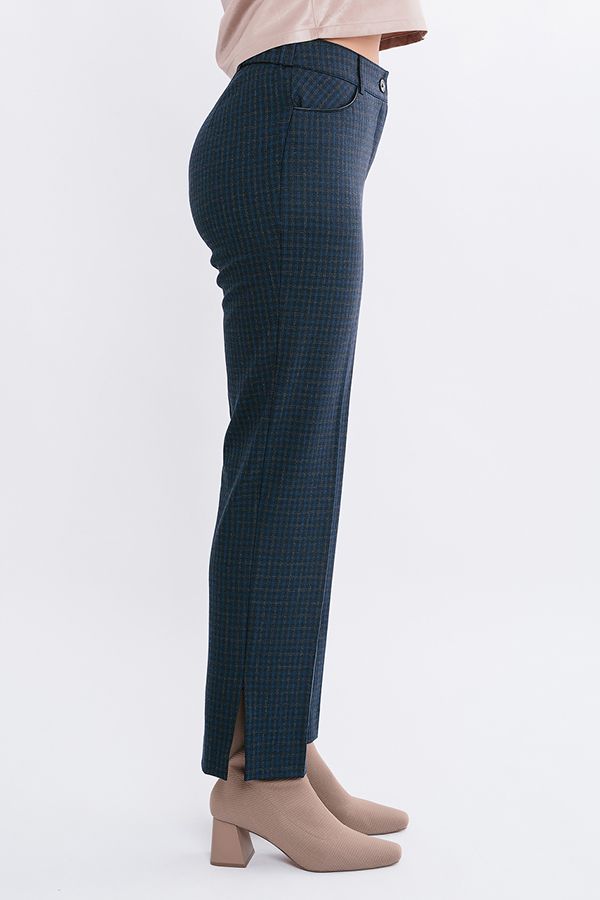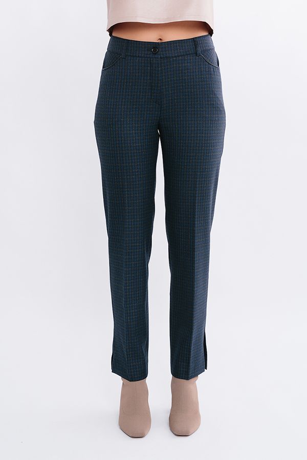 Комфортная модель брюк из темно-синей ткани в клетку. Силуэт слегка зауженный. Детали: Спереди застежка на молнию и пуговицу, карманы с горизонтальным входом, с отделкой из эко-кожи. По спинке вытачки, в поясе резина на сборке, на поясе шлевки. В боковых швах разрез (14 см). Длина по внутреннему шву - 75 см. Ширина низа - 19 см. Числовые параметры соответствуют размеру 44. Размер модели на фото: 44. Параметры модели: 86-63-94. Рост модели на фото: 173 см.