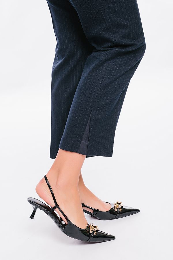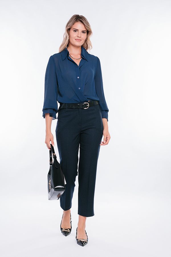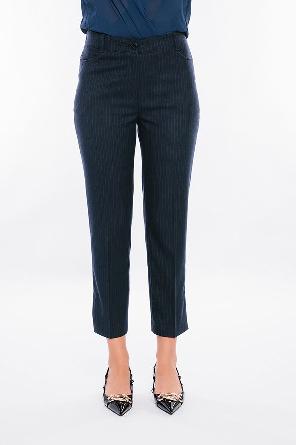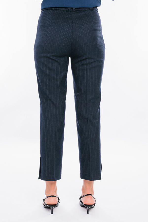 Комфортная модель брюк из темно-синей ткани в тонкую полоску. Силуэт слегка зауженный. Детали: Спереди застежка на молнию и пуговицу, карманы с горизонтальным входом, с отделкой из искусственной замши. По спинке вытачки, в поясе резина на сборке, на поясе шлевки. В боковых швах разрез (12 см) в виде шлицы с отделкой из искусственой замши. Длина по внутреннему шву - 66 см. Ширина низа - 19 см. Числовые параметры соответствуют размеру 44. Размер модели на фото: 44. Параметры модели: 86-63-94. Рост модели на фото: 173 см.