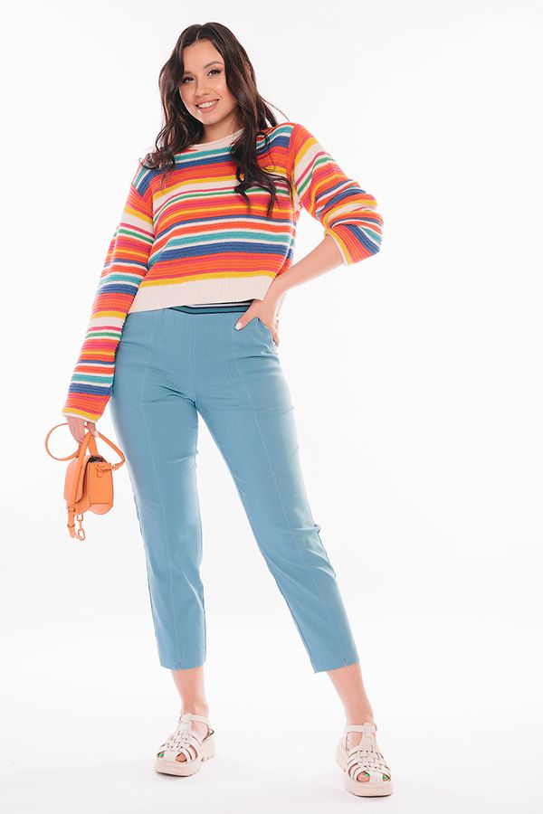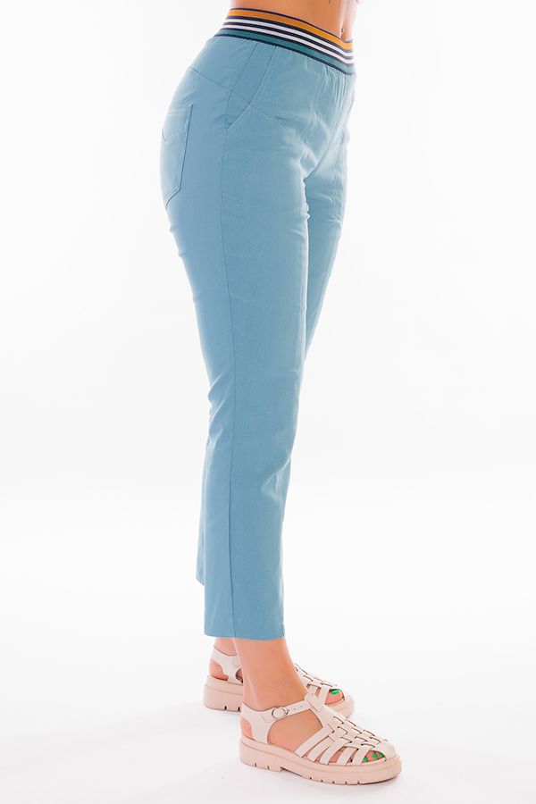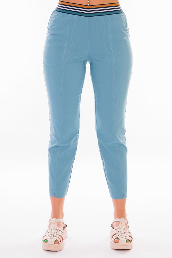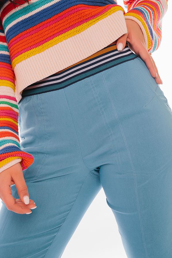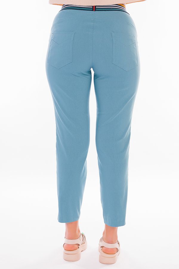 Модель брюк в спортивном стиле без застежки. Пояс выполнен из декоративной резины. Детали: спереди вертикальный рельеф, заканчивающийся небольшим разрезом, фигурно отстроченные боковые карманы. Сзади, под фигурной кокеткой, накладные карманы с отсрочкой. *Числовые параметры соответствуют размеру 42. Длина по внутреннему шву - 68 см. Ширина низа - 17 см. Размер модели на фото: 46. Параметры модели: 86-64-100. Рост модели на фото: 174 см.