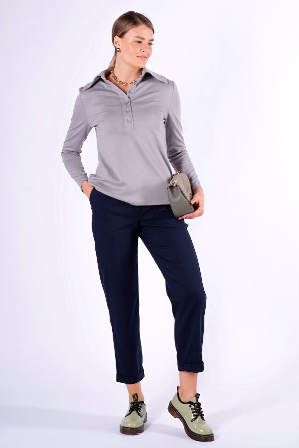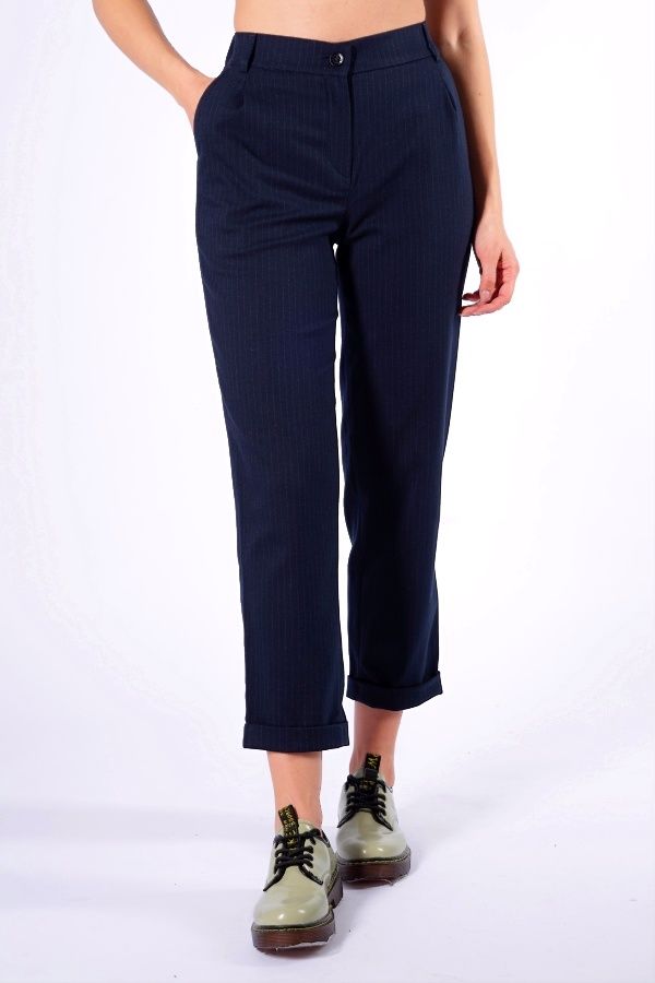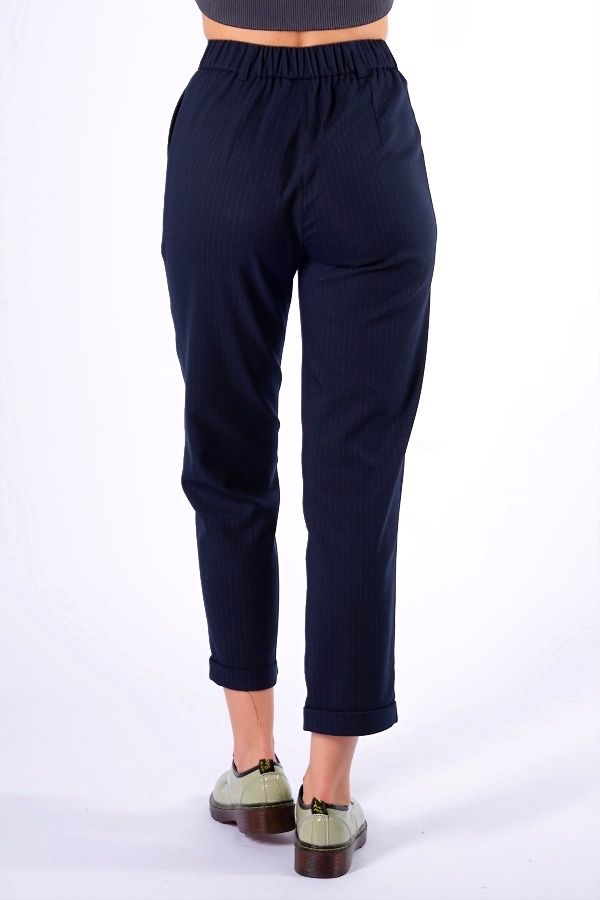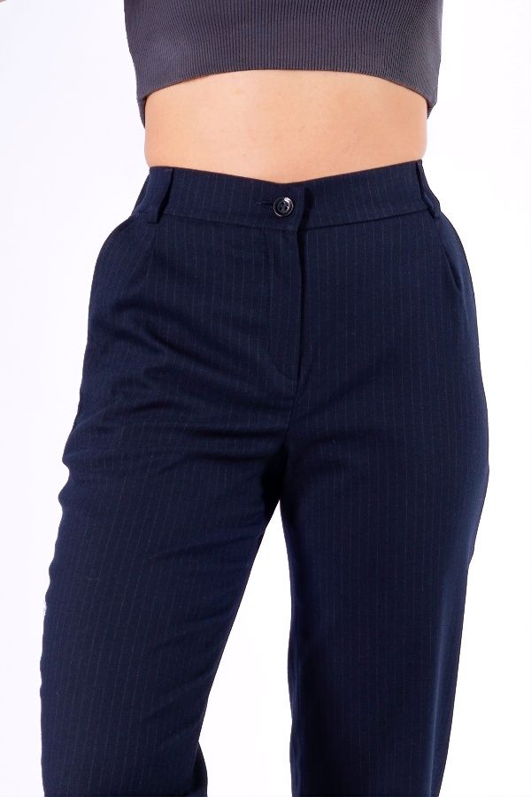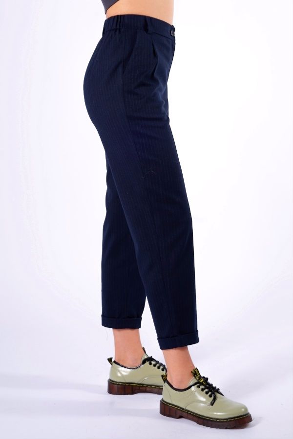Брюки из плотной темно-синей ткани в полосочку, свободного силуэта. Детали: застежка на молнию и пуговицу, по линии пояса по бокам зашитые защипы, полноценные боковые карманы с отрезным бочком. Сзади вытачкиПо линии низа оригинальная отделка. По задней половинке пояса резина. По линии низа отворот, который можно использовать для изменения длины брюк. Длина по внутреннему шву - 68,5 см. Ширина по линии низа - 18,5 см. *Числовые параметры соответствуют размеру 42. Размер модели на фото: 44. Параметры модели: 86-53-94. Рост модели на фото: 173 см.