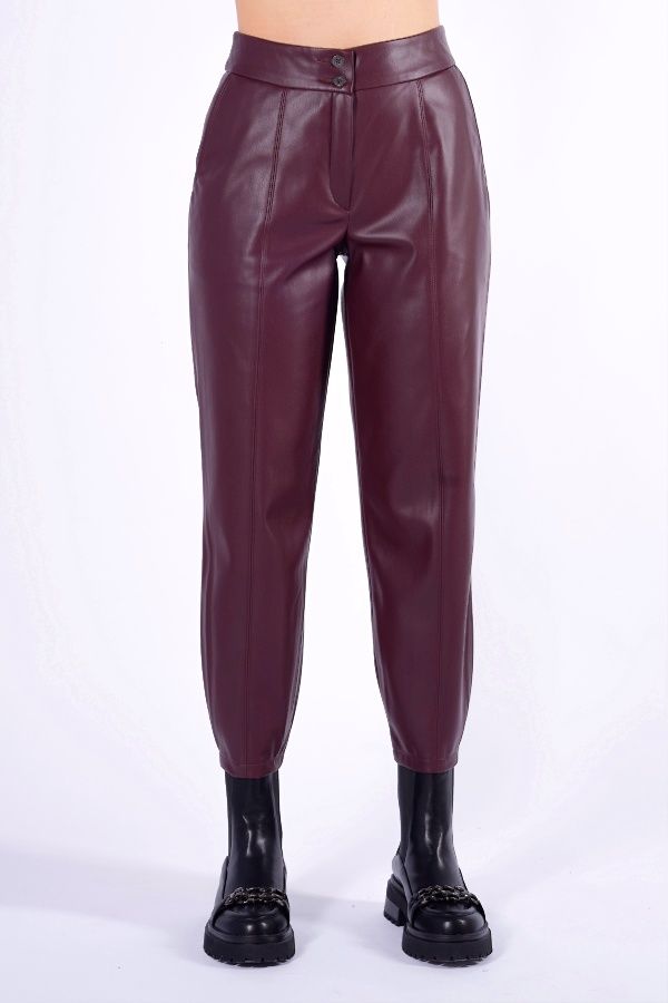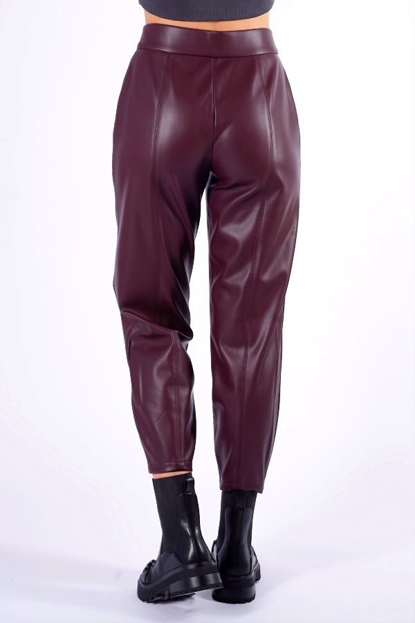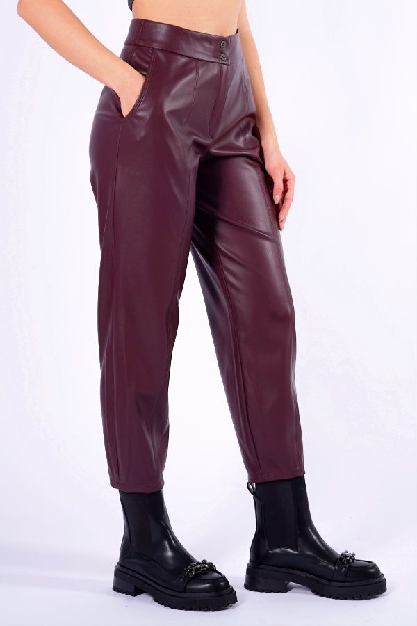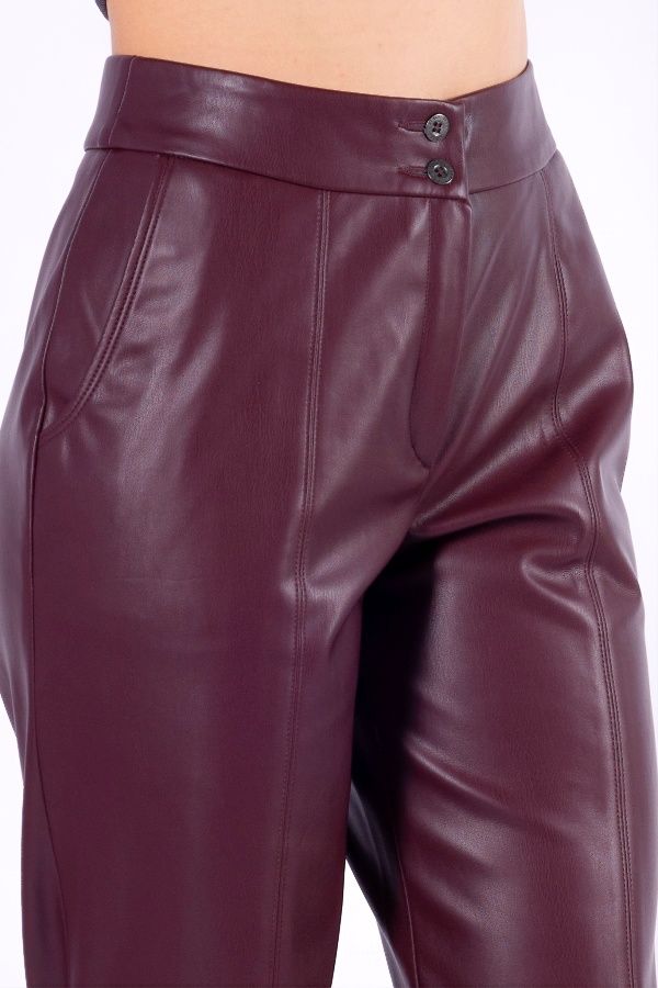 Молодежные брюки О-силуэта из бордовой эко-кожи. Детали: отстроченные вертикальные рельефы по передней и задней половинкам брюк, застежка на молнию и две пуговицы, боковые карманы с отрезным бочком. Длина по внутреннему шву: 66,5 см. Ширина низа: 16 см. Числовые параметры соответствуют размеру: 52. Размер модели на фото: 44. Параметры модели: 86-63-94. Рост модели на фото: 173 см.