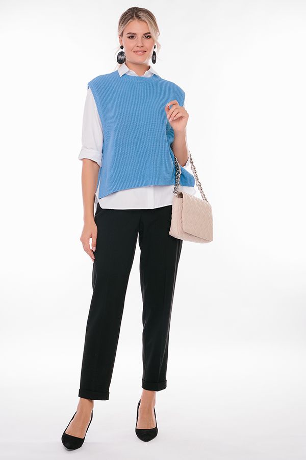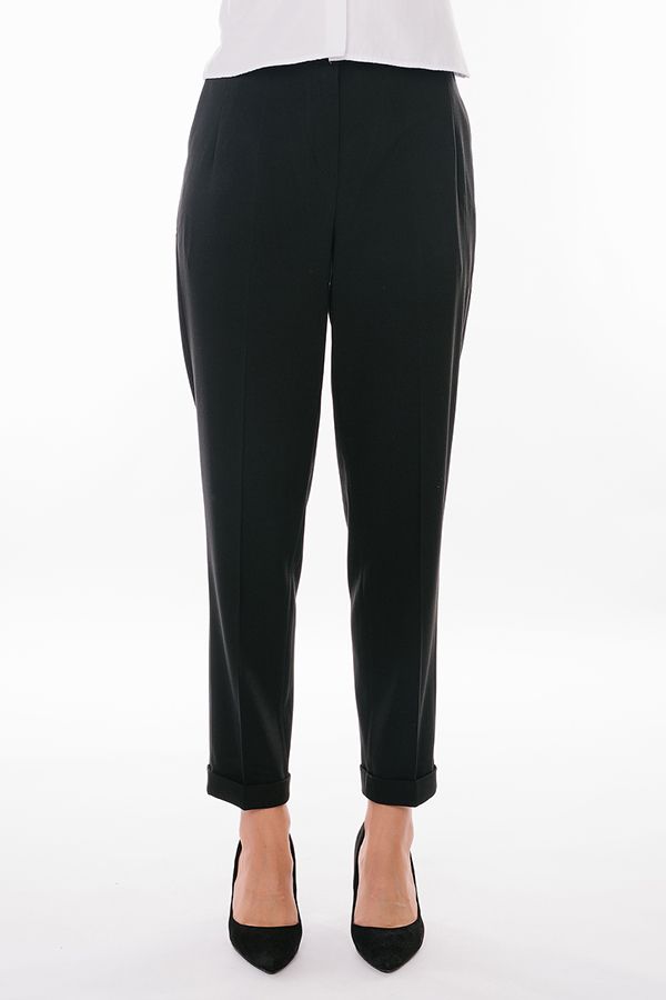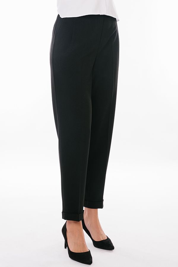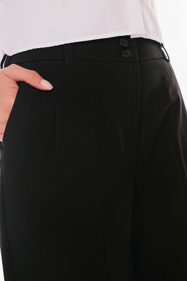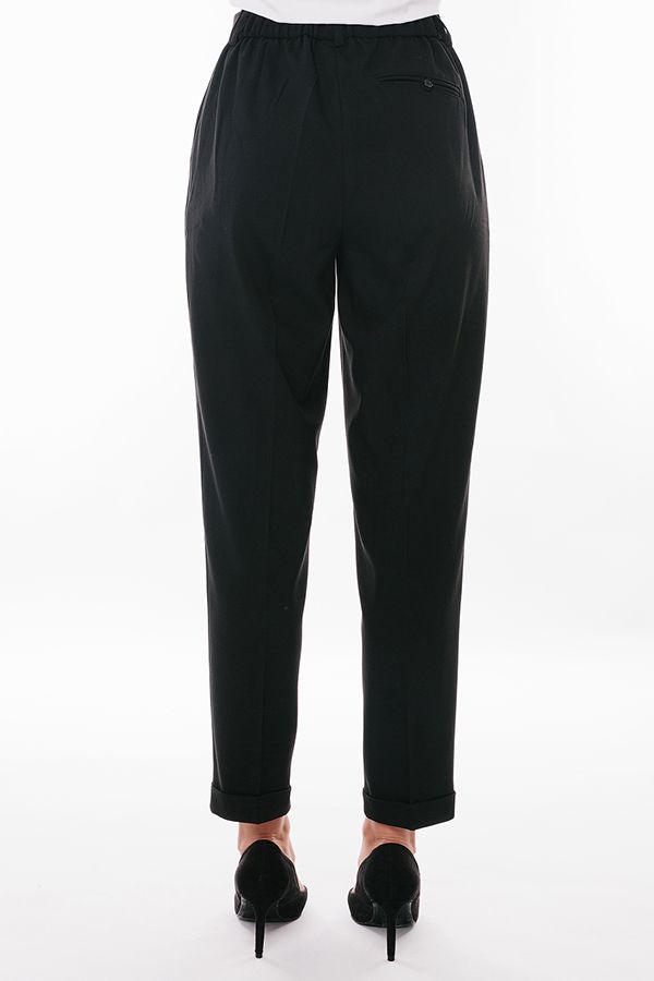 Брюки из костюмной ткани свободного силуэта. Детали: застежка на молнию и две пуговицы, по линии пояса по бокам вытачки, полноценные боковые карманы с отрезным бочком. Сзади вытачки, по правой половинке брюк, имитация кармана в рамке, на петле и пуговицей. По задней половинке пояса резина на сборке, шлевки. По линии низа отворот, который можно использовать для изменения длины брюк. Длина по внутреннему шву - 69 см. Ширина по линии низа - 17 см. *Числовые параметры соответствуют размеру 42. Размер модели на фото: 44. Параметры модели: 86-63-94. Рост модели на фото: 173 см.