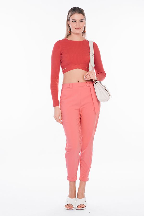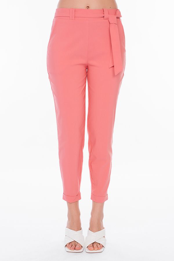 Модель брюк в молодежном стиле. Силуэт: бананы. Детали: спереди боковые карманы, на поясе шлевки, сзади в поясе резина, фигурная кокетка. По передней половинке брюк, в боковые швы вшит тканевый пояс. По линии низа отворот, с помощью которого можно регулировать длину брюк. Длина по внутреннему шву - 67 см. Ширина низа - 14 см. *Числовые параметры соответствуют размеру: 44. Размер модели на фото: 42. Параметры модели: 86-63-94 Рост модели на фото: 173 см.