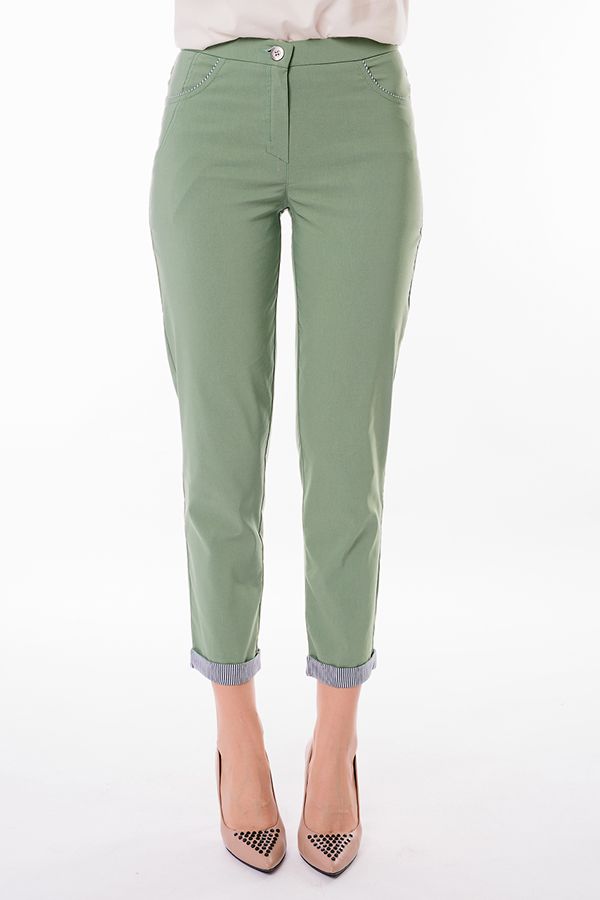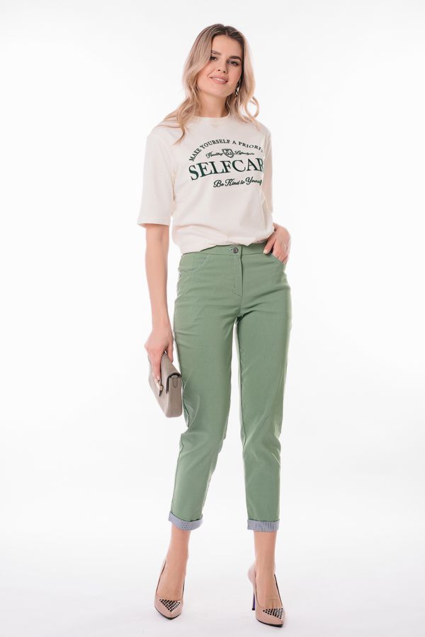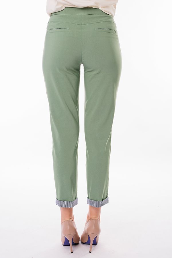 Современная модель брюк в стиле "Casual". Детали: спереди застежка на молнию и пуговицу, боковые карманы с горизонтальным входом и контрастной отделкой. Сзади под кокеткой листочки с имитацией карманов. В поясе резина. По низу брюк функциональный отворот с контрасной отделкой. Длина по внутреннему шву - 69 см. Ширина низа - 14 см. *Числовые параметры соответствуют размеру 44.  Размер модели на фото: 44. Параметры модели: 86-53-94. Рост модели на фото: 173 см.