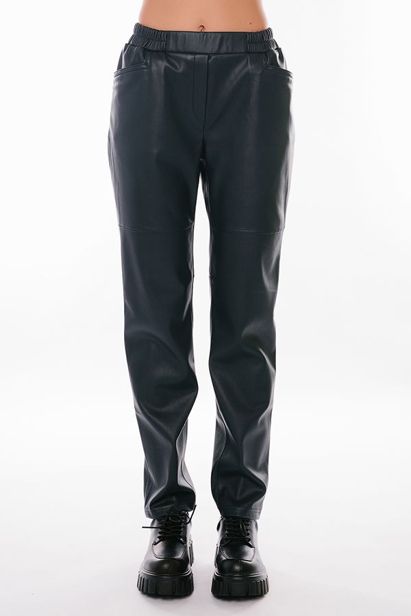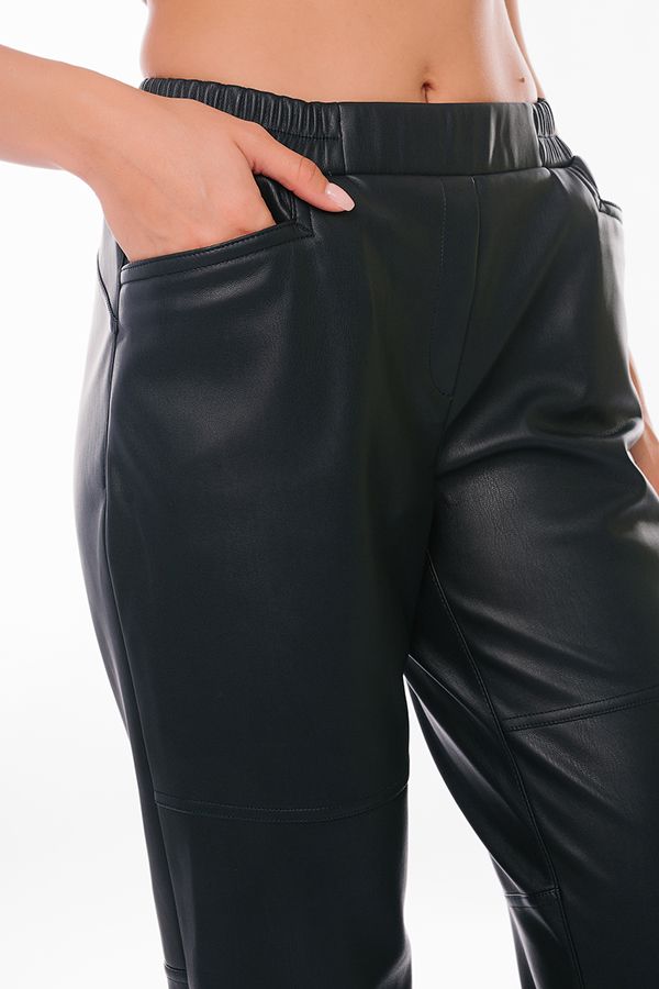 Стильные брюки из экокожи в молодежном стиле. Силуэт прямой от колена, книзу заужен на 1,5 см, с имитацией гульфика, карманы с отрезным бочком прямоугольной формы. Пояс на резине. Сзади кокетка. По задней половине брюк горизонтальные резы ниже уровня колена, по передней половине- выше уровня колена. Отделка: двойными строчками, закрепки.