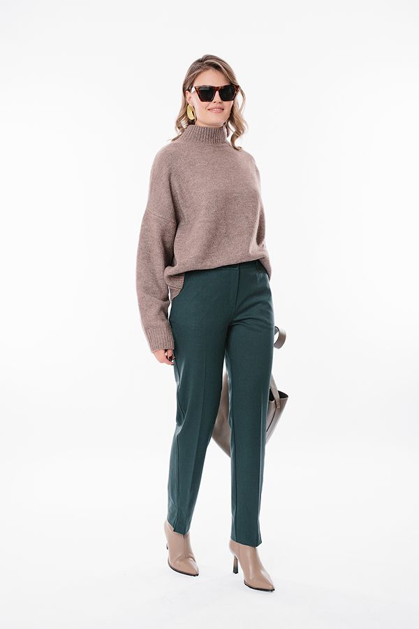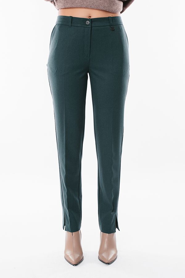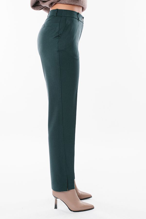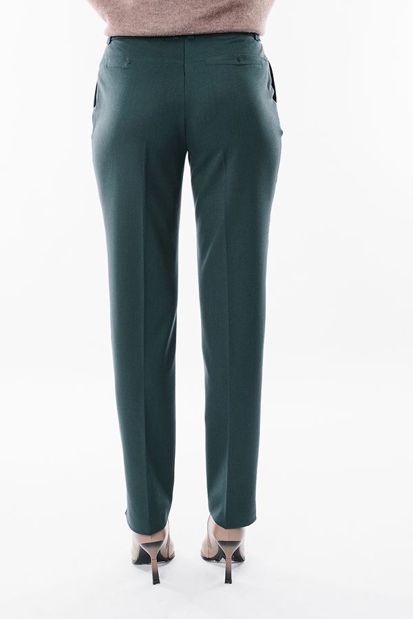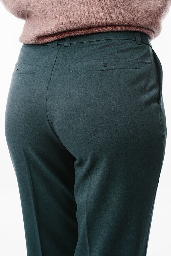 Модель брюк из зелёной костюмной ткани в городском стиле. Спереди застежка на молнию и пуговицу, боковые карманы, сзади кокетка с оригинальным решением имитации карманов. Смещенный боковой шов с отстрочкой , заканчивается разрезом 9 см. Длина по внутреннему шву - 76 см. Ширина низа - 16,5 см. *Числовые параметры соответствуют размеру 44. Размер модели на фото: 46. Параметры модели: 86-63-94. Рост модели на фото: 173 см. Внимание! Брюки маломерят!