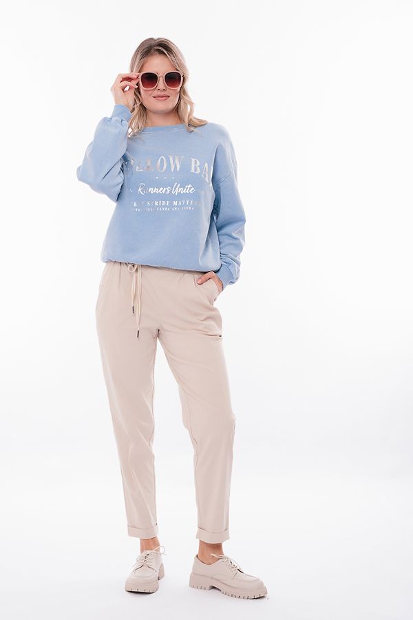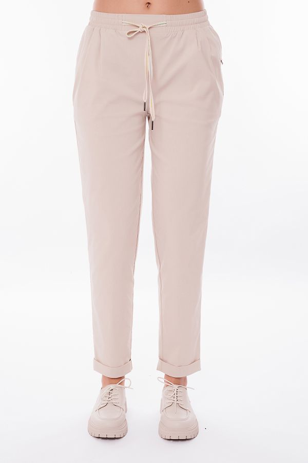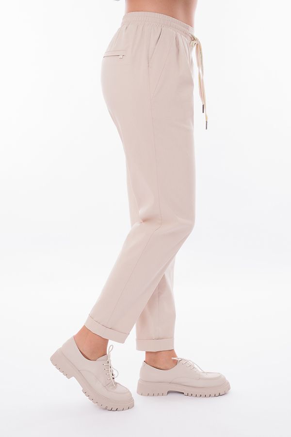 Модель брюк в молодежном стиле без застежки (пояс на резине). Детали: спереди полноценные карманы с оригинальной отделкой, в пояс вставлен декоративный шнурок, сзади листочки с имитацией карманов. По линии низа отворот, с помощью которого можно регулировать длину брюк. Длина по внутреннему шву - 71 см. Ширина низа - 18,5 см. *Числовые параметры соответствуют размеру 48. Размер модели на фото: 44. Параметры модели на фото: 86-63-94. Рост модели на фото: 173 см.