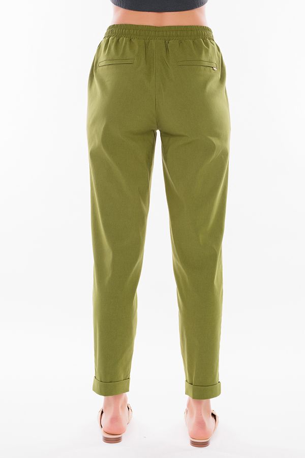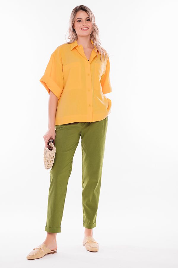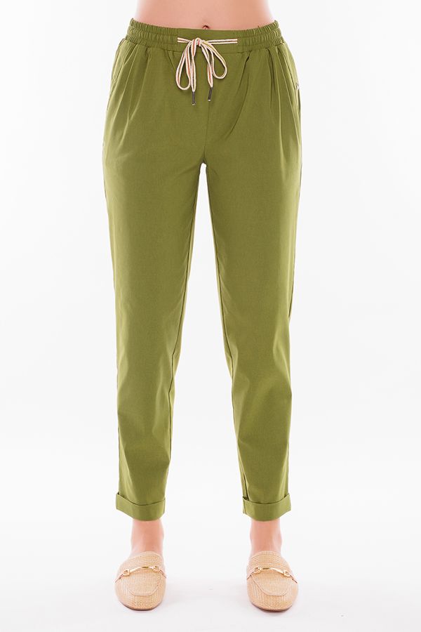 Модель брюк в молодежном стиле без застежки (пояс на резине). Детали: спереди полноценные карманы с оригинальной отделкой, в пояс вставлен декоративный шнурок, сзади листочки с имитацией карманов. По линии низа отворот, с помощью которого можно регулировать длину брюк. Длина по внутреннему шву - 71 см. Ширина низа - 18,5 см. *Числовые параметры соответствуют размеру 48. Размер модели на фото: 44. Параметры модели на фото: 86-63-94. Рост модели на фото: 173 см.