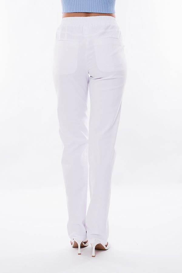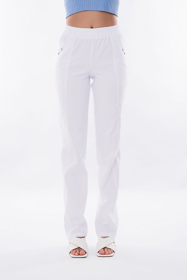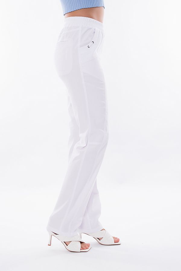 Модель брюк в спортивном стиле без застежки (пояс на резине). Детали: спереди вертикальный рельеф, боковые карманы с оригинальной отделкой люверсами, сзади, под кокеткой, внутренние карманы с листочкой. *Числовые параметры соответствуют размеру 52. Длина по внутреннему шву: 83 см. Ширина по линии низа: 20 см. Размер модели на фото: 44.  Параметры модели: 86-63-94. Рост модели на фото: 173 см.