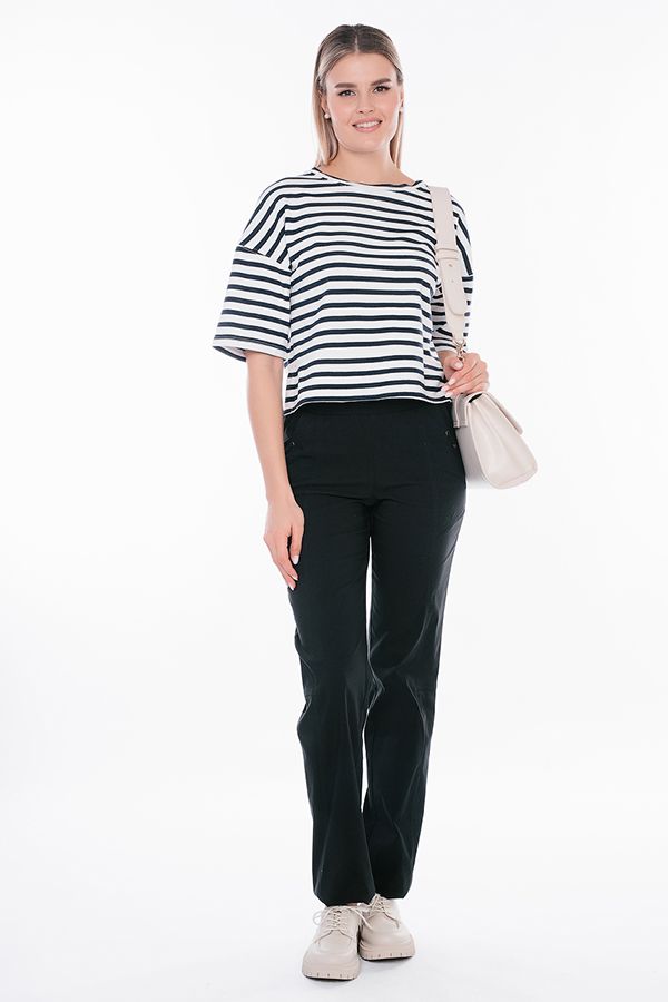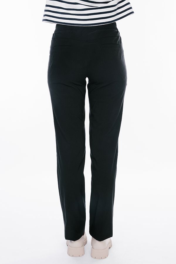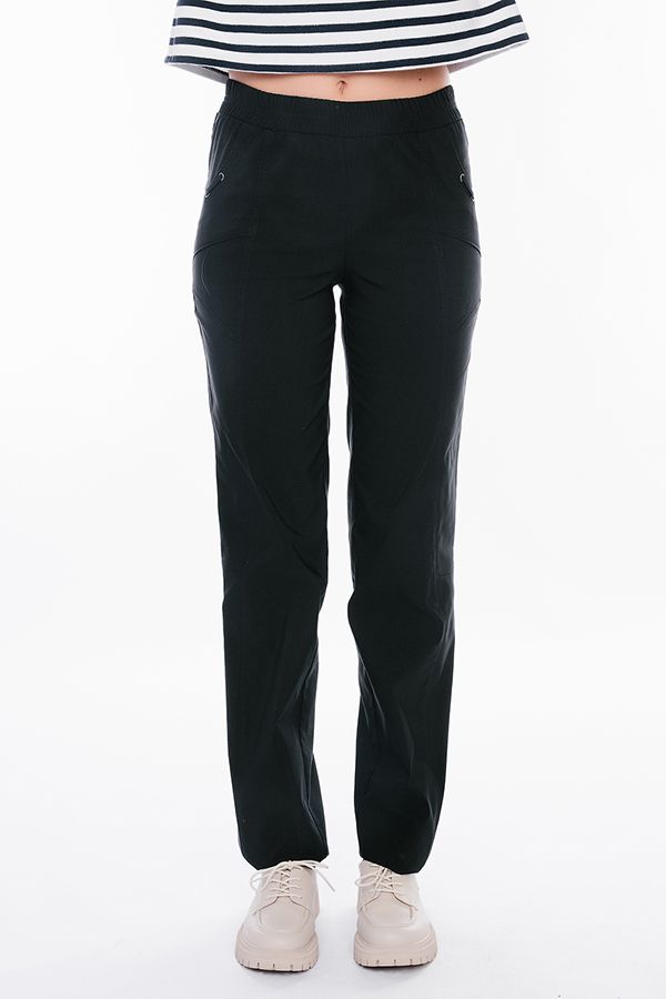 Модель брюк в спортивном стиле без застежки (пояс на резине). Детали: спереди вертикальный рельеф, боковые карманы с оригинальной отделкой люверсами, сзади, под кокеткой, внутренние карманы с листочкой. *Числовые параметры соответствуют размеру 52. Длина по внутреннему шву: 83 см. Ширина по линии низа: 20 см. Размер модели на фото: 44.  Параметры модели: 86-63-94. Рост модели на фото: 173 см.