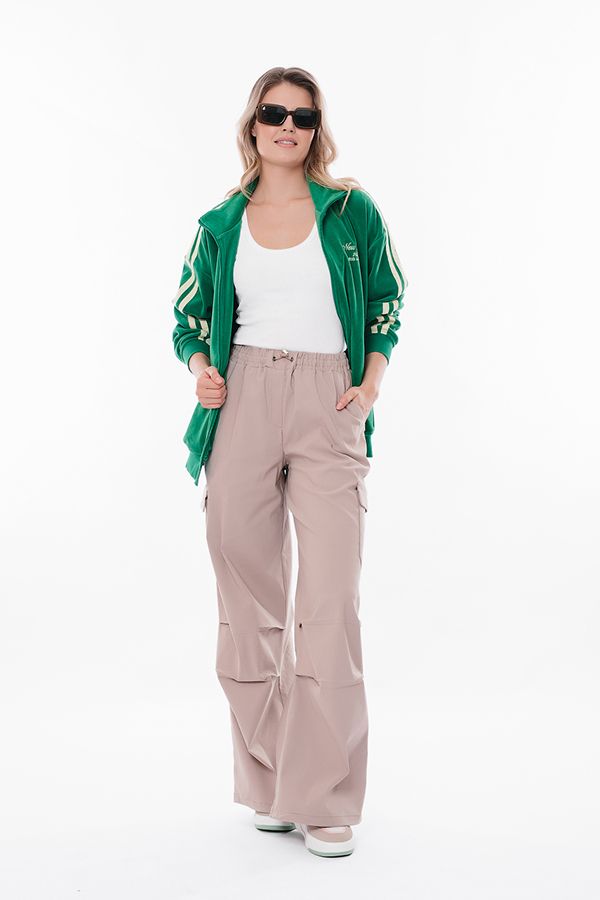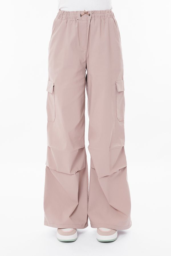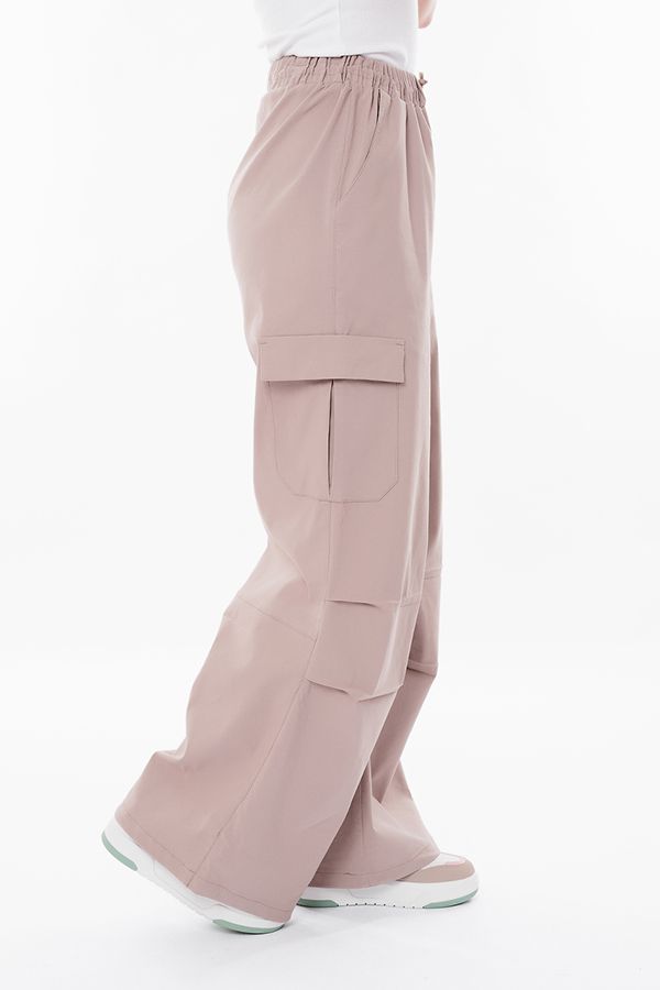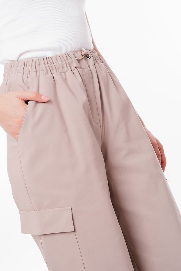 Модные брюки -парашюты в стиле "карго" из бежевого бенгалина. Спереди имитация гульфика, карманы с отрезным бочком, по бокам накладные дизайнерские карманы. В районе колен по передней половинке два горизонтальных защипа, по задней половинке горизонтальный рез. В поясе резина и кулиска. По низу изделия кулиска. Длина по внутреннему шву - 81 см. Ширина по линии низа: 34 см. *Числовые параметры соответствуют размеру 42. Размер модели на фото: 44. Параметры модели: 86-63-94. Рост модели на фото: 173 см.