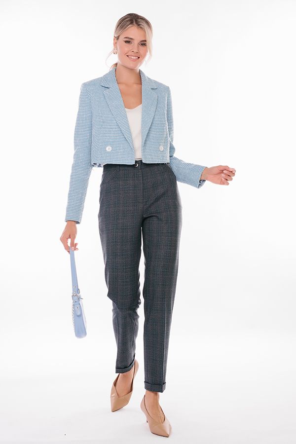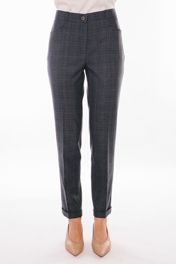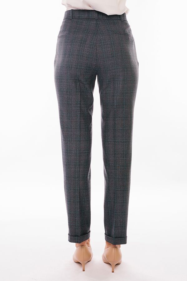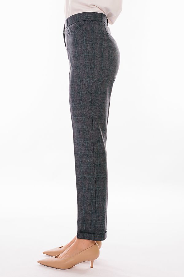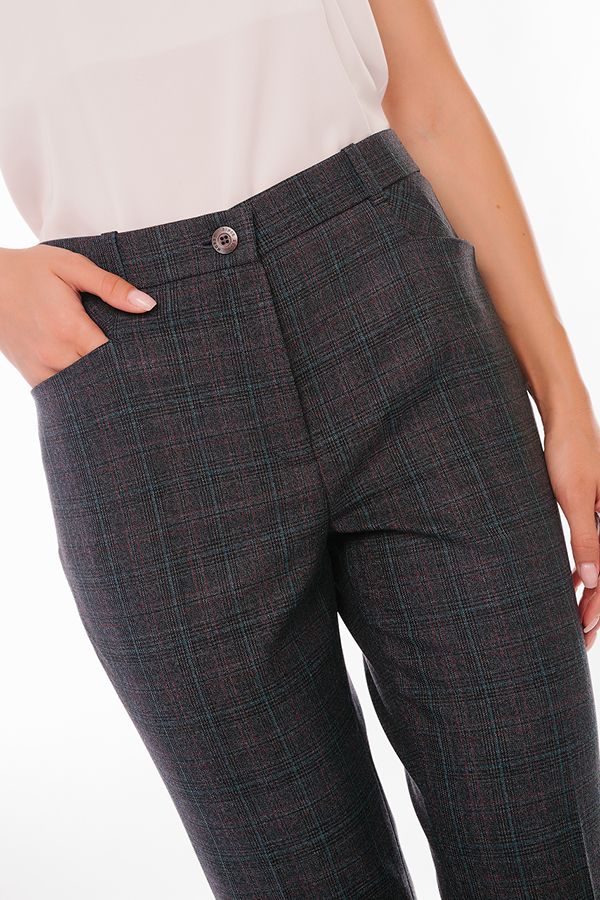 Модель в классическом стиле со стрелками. Детали: спереди застежка на молнию и пуговицу, боковые карманы с горизонтальным входом. Отделка сзади: вытачки, по правой половине листочка с имитацией кармана. В пояс вставлена эластичная лента. По линии низа отворот, который можно использовать для изменения длины брюк.