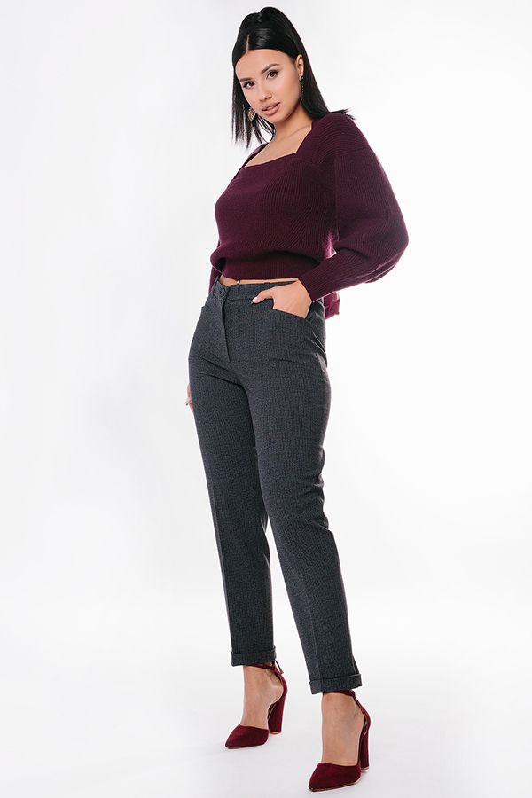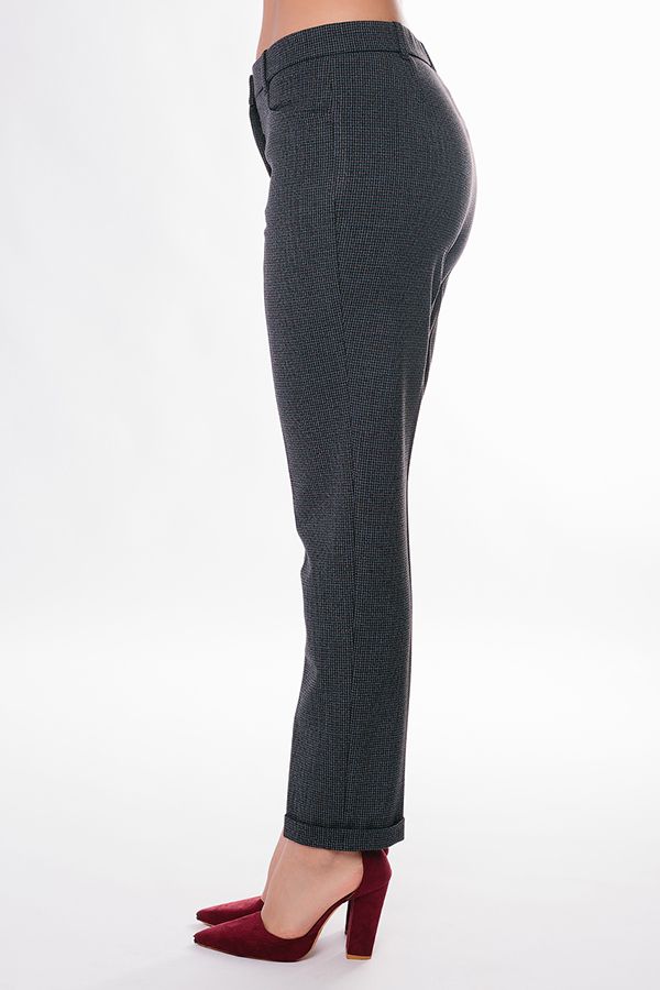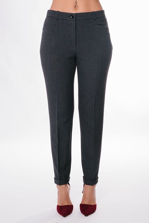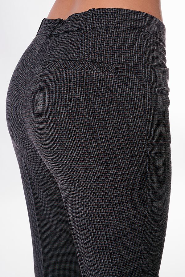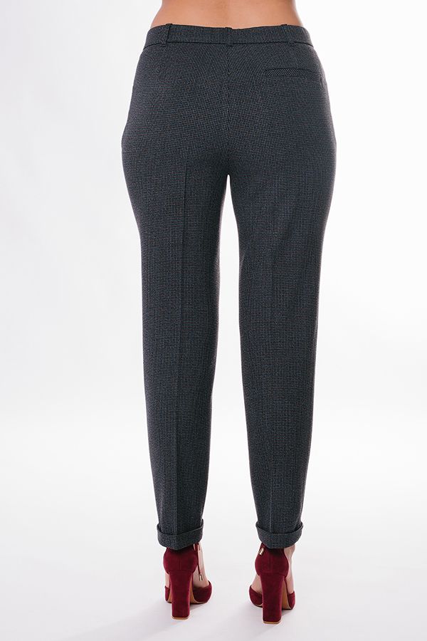 Модель в классическом стиле со стрелками. Детали: спереди застежка на молнию и пуговицу, боковые карманы с горизонтальным входом. Отделка сзади: вытачки, по правой половине листочка с имитацией кармана. В пояс вставлена эластичная лента. По линии низа отворот, который можно использовать для изменения длины брюк. Длина по внутреннему шву - 74 см. Ширина низа - 18 см.