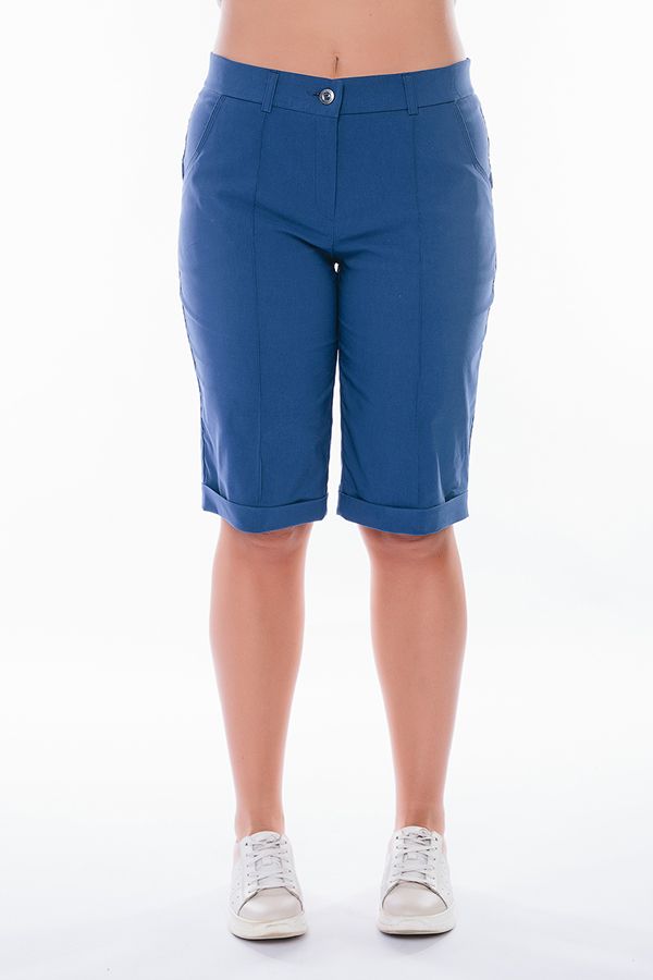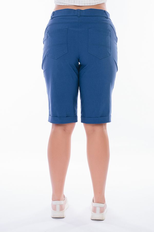 Бермуды с застроченной стрелкой в городском стиле. Детали: спереди застежка на молнию, боковые карманы, шлевки на поясе, по линии низа отворот, сзади под фигурной кокеткой накладные карманы. Отделка кокетки и карманов спереди - тройная строчка. Длина по внутреннему шву - 33 см. Ширина низа - 25,5 см. *Числовые параметры соответствуют размеру 48. Размер модели на фото: 48. Параметры модели: 94-68-102. Рост модели на фото: 175 см.