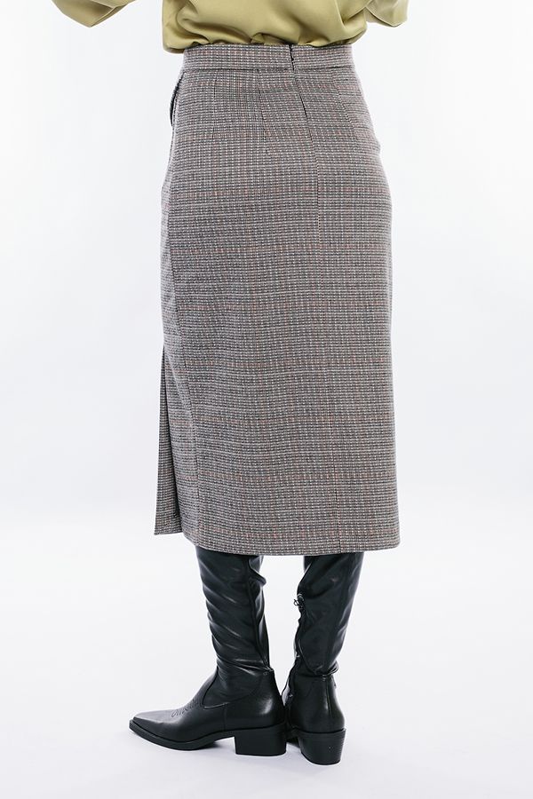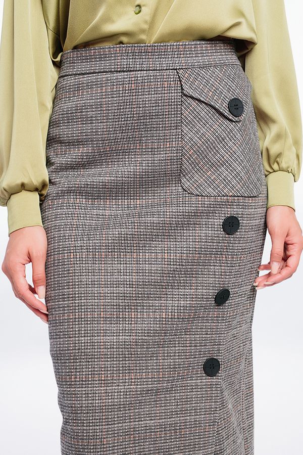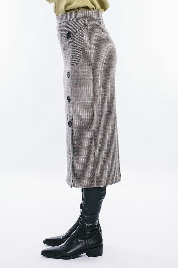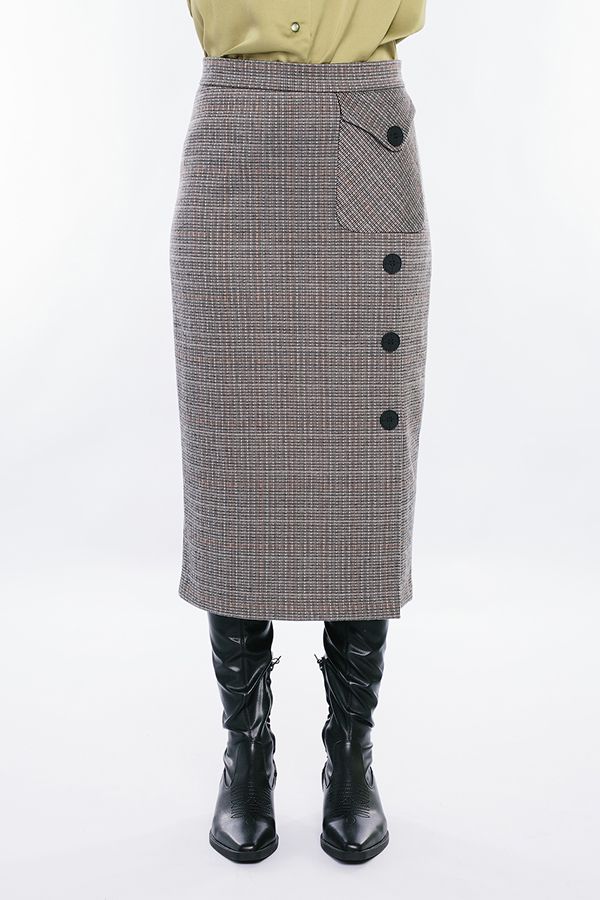 Юбка прямого силуэта, длинная. Детали: Юбка на притачном поясе, оригинальный карман с клапаном над разрезом по левой стороне изделия, оформлен крупными пуговицами. Сзади по две вытачки, в среднем шве потайная молния. Изделие на подкладке. Линейка 44-54 представленна в единственном цветовом решении на каждый размер. Длина изделия 78 см. Размер модели на фото: 44. Параметры модели: 86-63-94. Рост модели на фото: 173 см.
