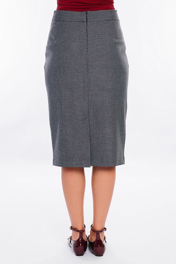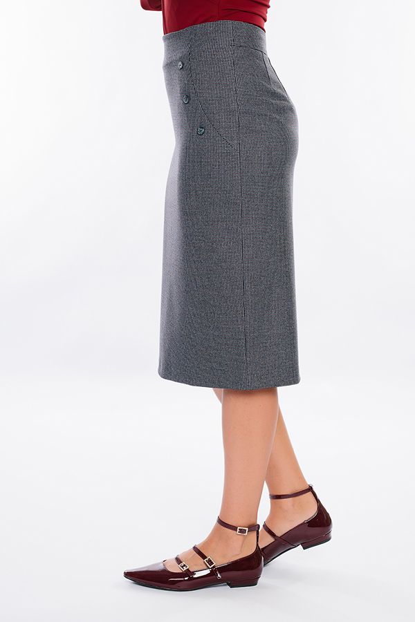 Элегантная юбка-карандаш из костюмной ткани. Передняя половинка юбки выполнена без пояса, с подрезным бочком, украшена рядом пуговиц. Сзади фигурный пояс, с потайной молнией и двумя вытачками с каждой стороны, щлица. Изделие на подкладке. Длина изделия 68 см. Размер модели на фото: 44. Параметры модели: 86-63-94. Рост модели на фото: 173 см.