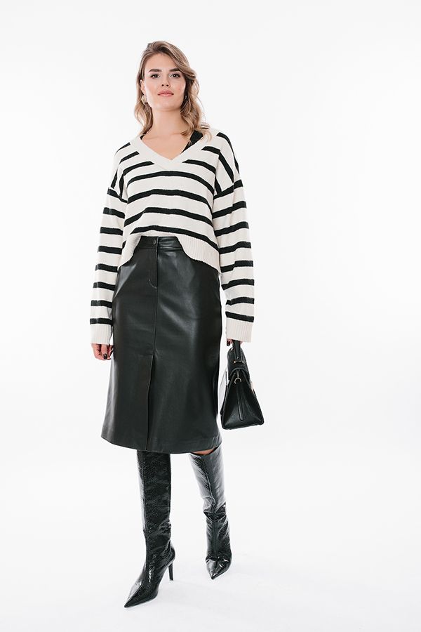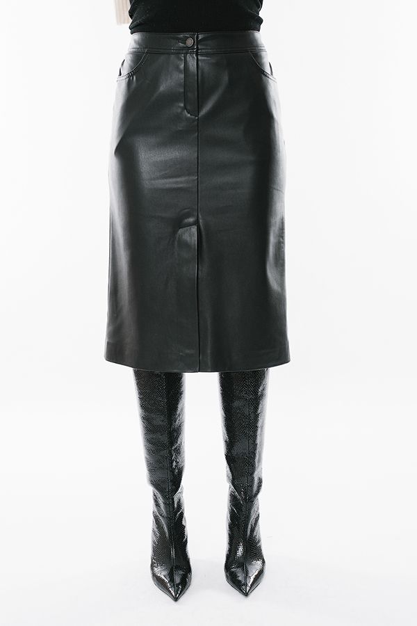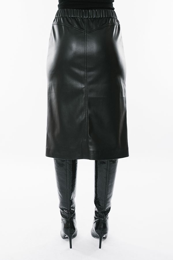 Современная молодежная юбка из черной эко-кожи. Детали: Спереди застежка на молнию и пуговицу, карманы с горизонтальным входом, в среднем шве шлица. Сзади кокетка с двойной отстрочкой. В поясе по спинке резина. Длина изделия 68 см. Размер модели на фото: 44. Параметры модели: 86-63-94. Рост модели на фото: 173 см.