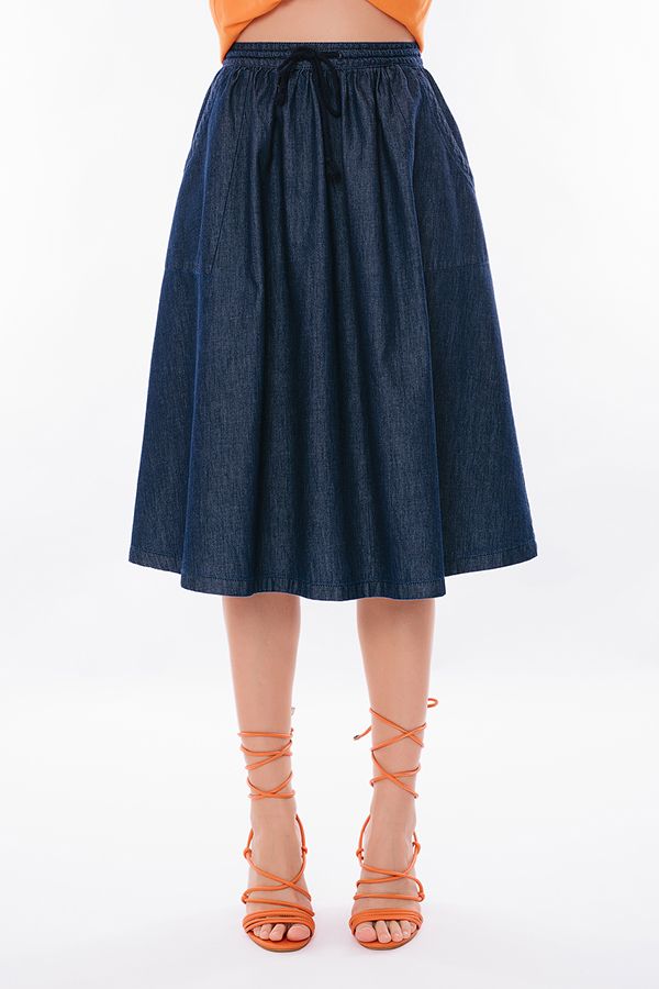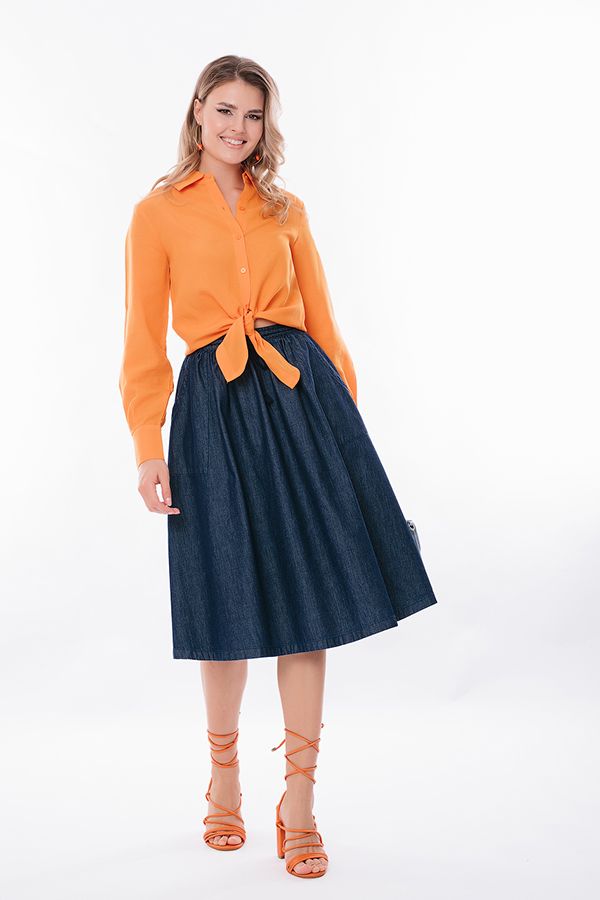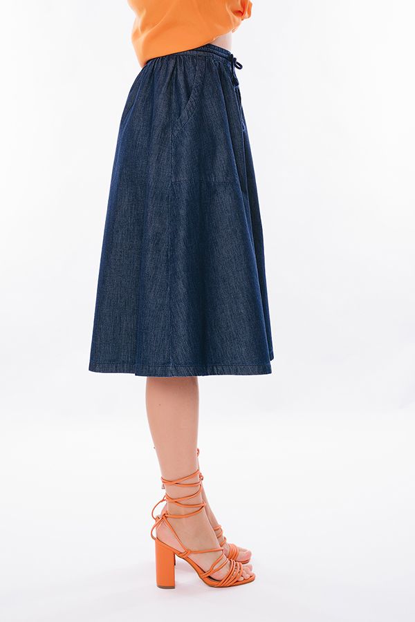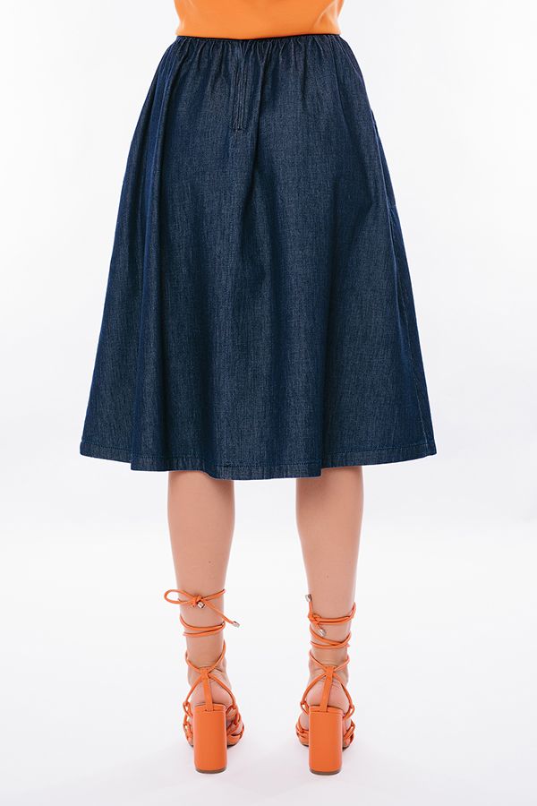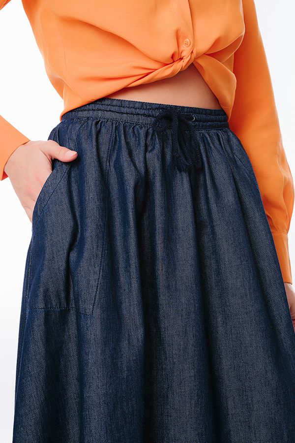 Модель юбки А-силуэта, с легкой сборкой по талии, свободная. Детли спереди: прямой пояс с кулиской, карманы оригинального кроя, сзади , в среднем шве молния Длина изделия 75 см. Размер модели на фото: 40. Параметры модели: 86-63-94. Рост модели на фото: 173 см.