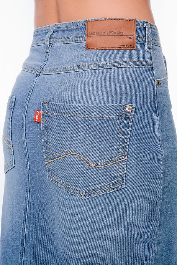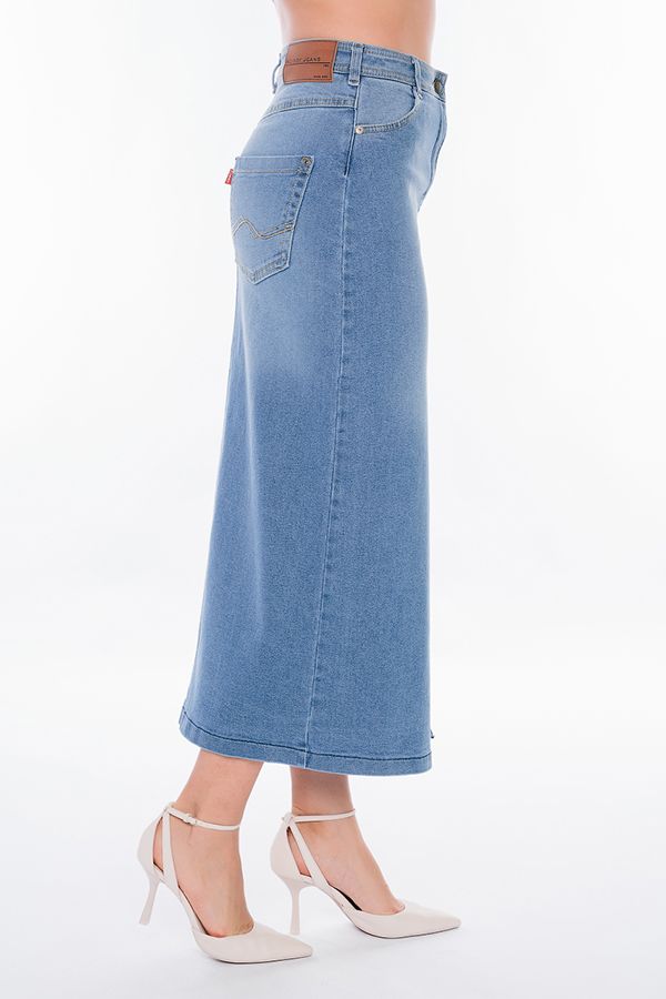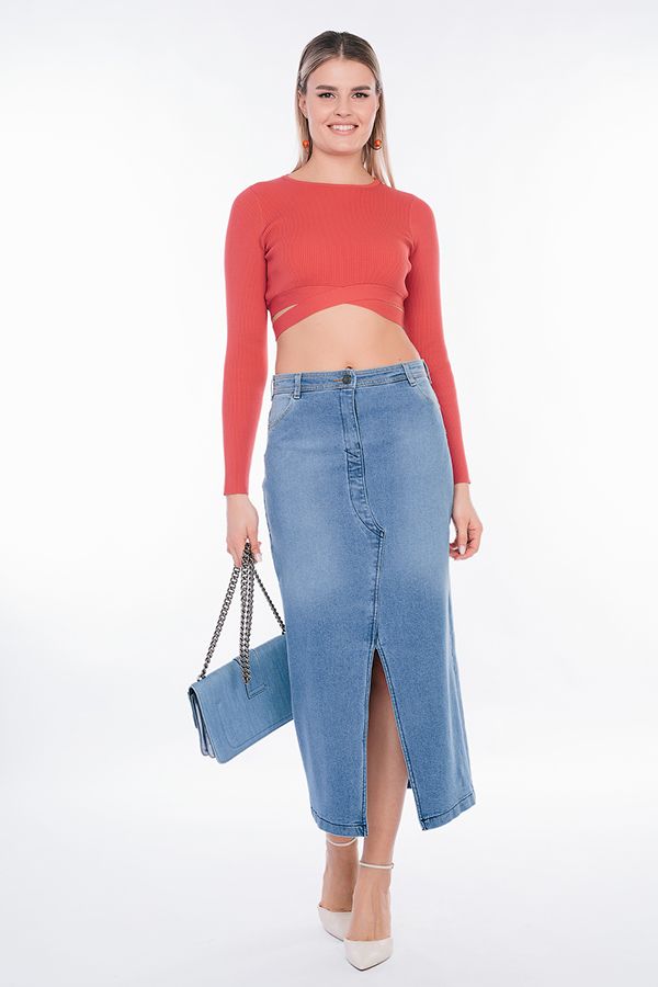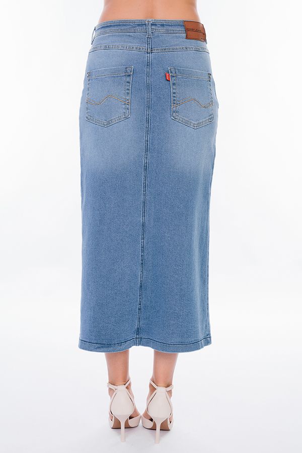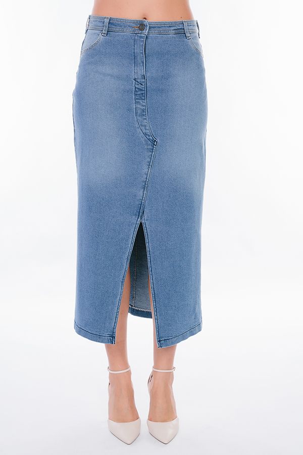 Юбка миди из денима. Спереди карманы, фигурный передний шов, переходяший в разрез, сзади под кокеткой накладные карманы. Застежка на молнию и болт. На поясе шлевки. Длина изделия - 88 см. Размер модели на фото: 44. Параметры модели: 86-63-94. Рост модели на фото: 173 см.