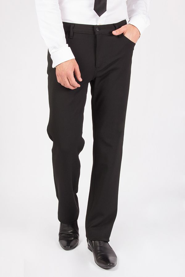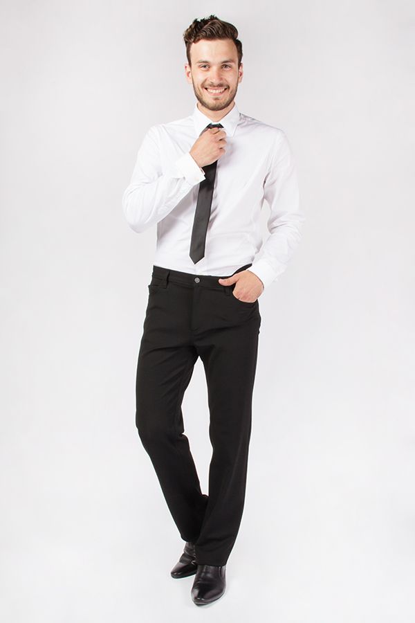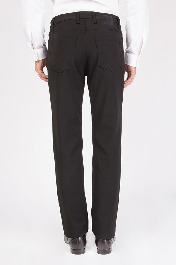 Брюки в джинсовом стиле. Силуэт прямой. Детали спереди: застежка на молнию и пуговицу, шлевки на поясе, три боковых кармана. Детали сзади: под кокеткой два накладных кармана, на поясе фирменная нашивка.