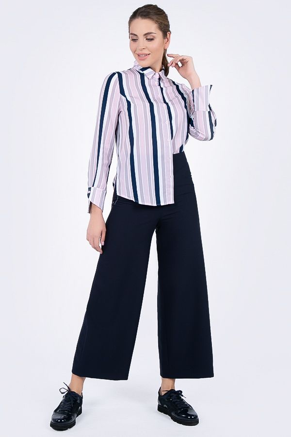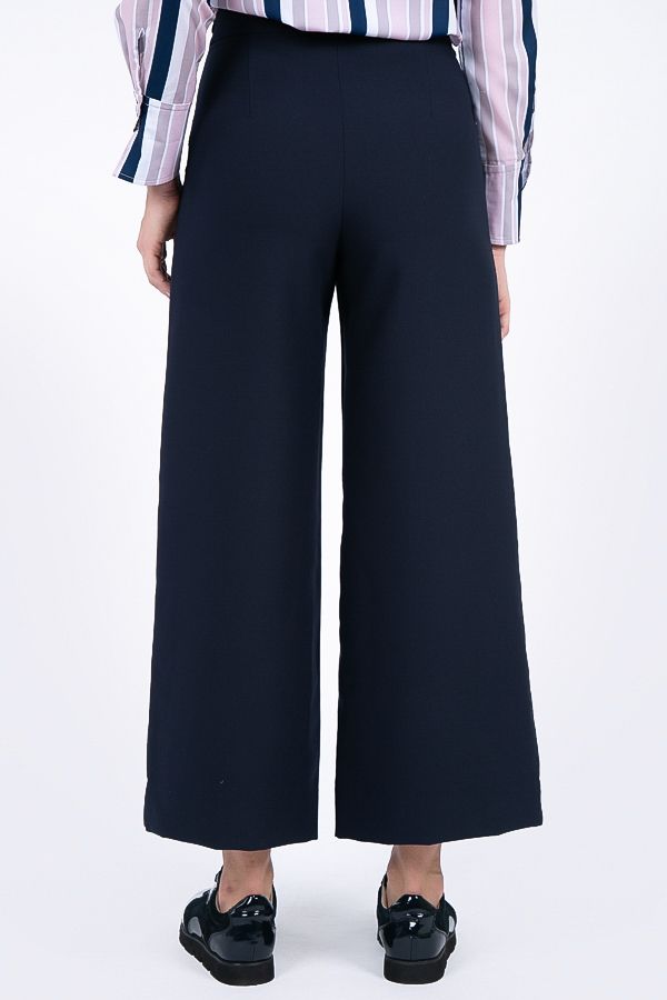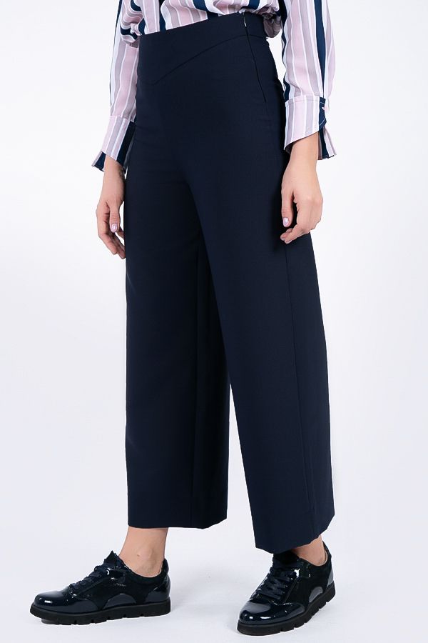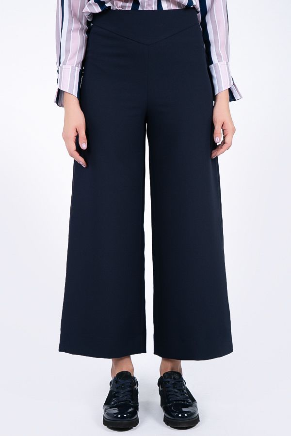 Брюки-кюлоты в городском стиле с заутюженной стрелкой. Широкие укороченные брюки длины 9/10. Детали: Спереди кокетка, застежка сбоку на потайную молнию. Сзади- вытачки.