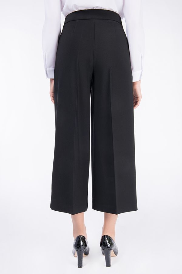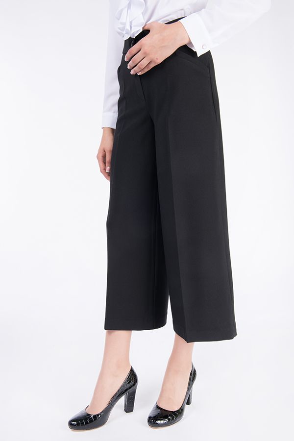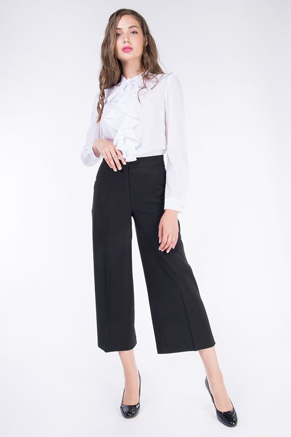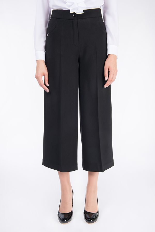 Брюки-кюлоты в городском стиле. Широкие укороченные брюки до середины голени. Детали: застежка на молнию и пуговицу, по бокам полноценные карманы, сзади вытачки. Длина по внутреннему шву - 56 см. Ширина низа - 33 см. *Числовые параметры соответствуют размеру 42 Размер модели на фото: 42 Параметры модели: 97-62-91 Рост модели на фото: 175