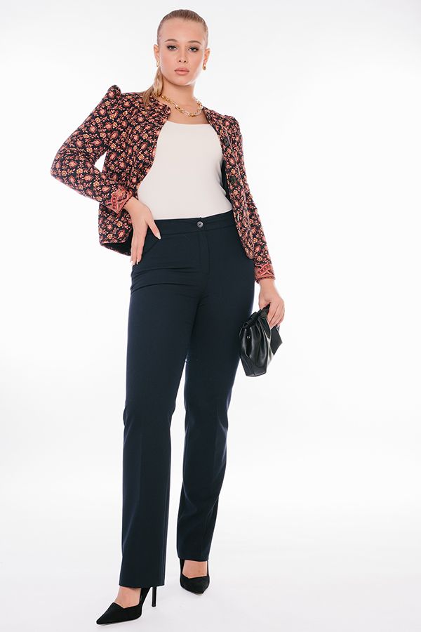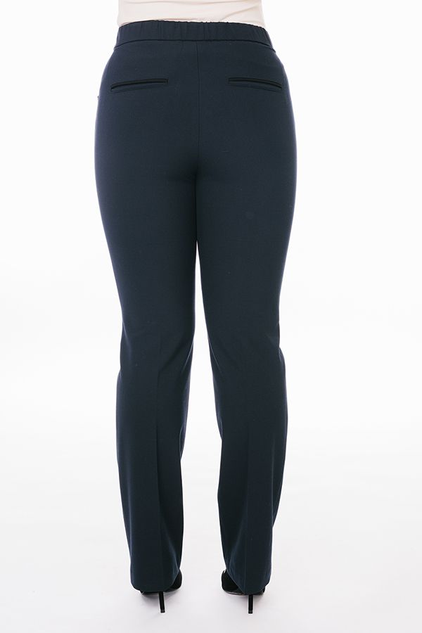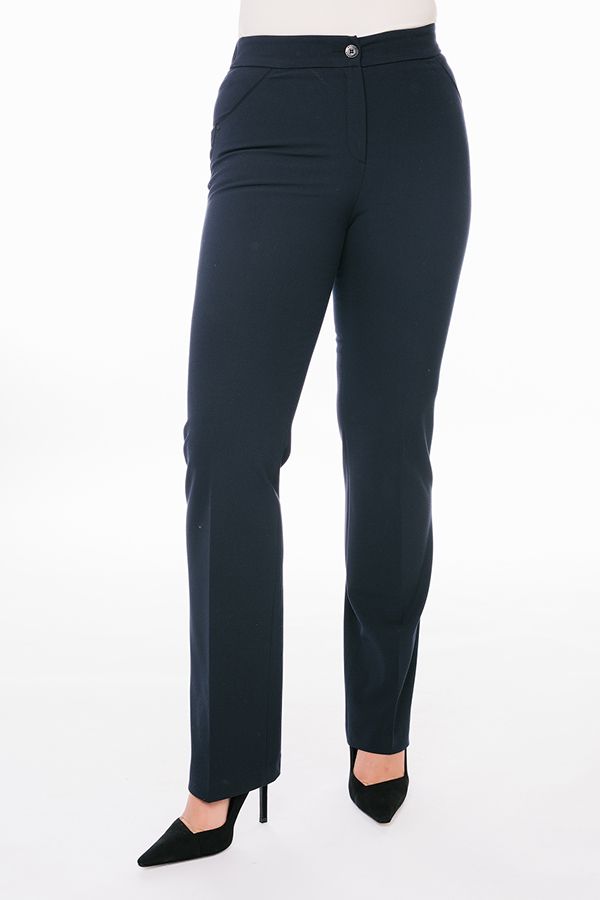 Классическая модель брюк в полную длину. Детали: брюки с высокой посадкой, застежка на молнию и пуговицу, по задней половинке пояса вставлена резина, имитация боковых карманов с отделкой, сзади рамки с имитацией кармана. Длина по внутреннему шву - 84 см. Ширина низа - 21 см. *Числовые параметры соответствуют размеру 44. Размер модели на фото: 46 Параметры модели: 90-68-99. Рост модели на фото: 175 см.