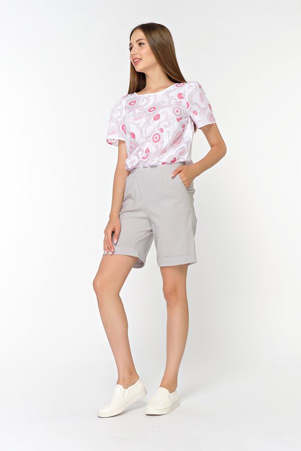 Модель шорт в спортивном стиле без застежки (пояс на резине).  Детали: спереди вертикальный рельеф, боковые карманы (отделка - двойная строчка), сзади фигурная кокетка. По низу  манжеты. *Числовые параметры соответствуют размеру 44 Длина по внутреннему шву - 23 см. Ширина по линии низа - 27 см. Размер модели на фото: 42 Параметры модели: 97-62-91 Рост модели на фото: 175