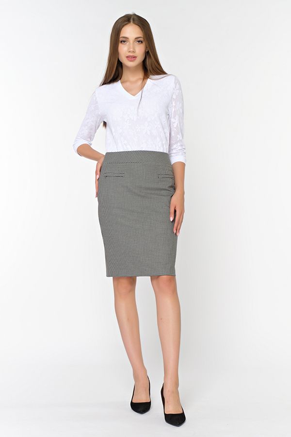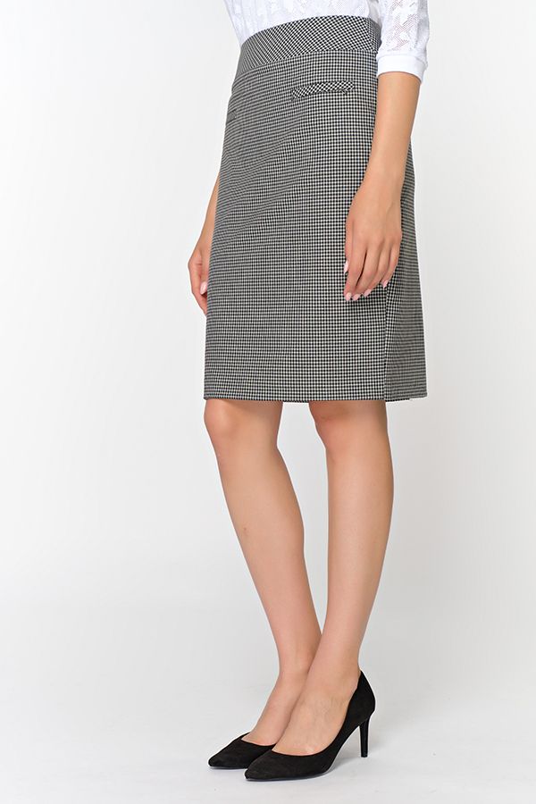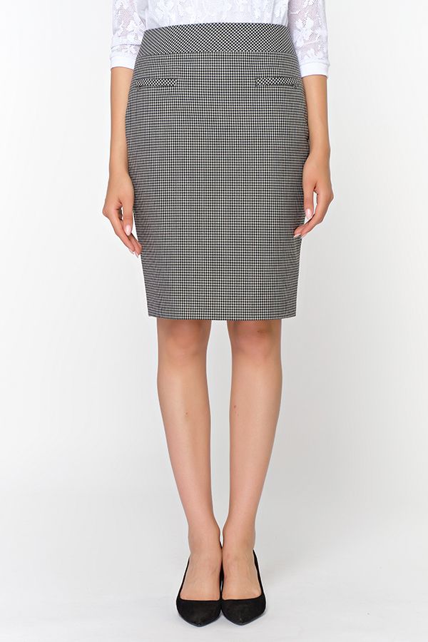 Юбка в классическом стиле, до середины колена, чуть приуженная. Спереди имитация кармана с декоративным элементом. Притачной пояс. Эксклюзивная линейка с 42-56 размеры представлена в единственном цветовом решении на каждый размер. Длина изделия в размерах 42-48 - 57 см., в размерах 50-56 - 62 см. ДАННОЕ ИЗДЕЛИЕ ПРОДАЕТСЯ ТОЛЬКО В ЛИНЕЙКАХ 42-56. Размер модели на фото: 42. Параметры модели: 97-62-91. Рост модели на фото: 175