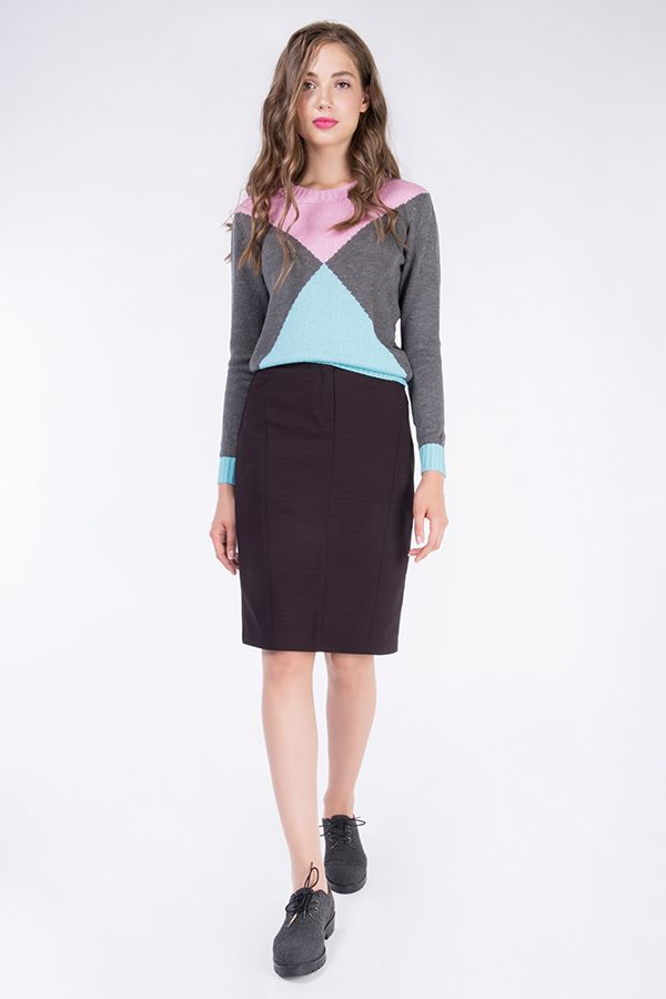 Юбка в джинсовом стиле, до середины колена, чуть приуженная, с рельефными отстрочками по передней и задней половинке. Спереди имитация карманов, гульфик, сзади кокетка. Притачной пояс. Длина изделия - 57 см. Размер модели на фото: 42 Параметры модели: 97-62-91 Рост модели на фото: 175