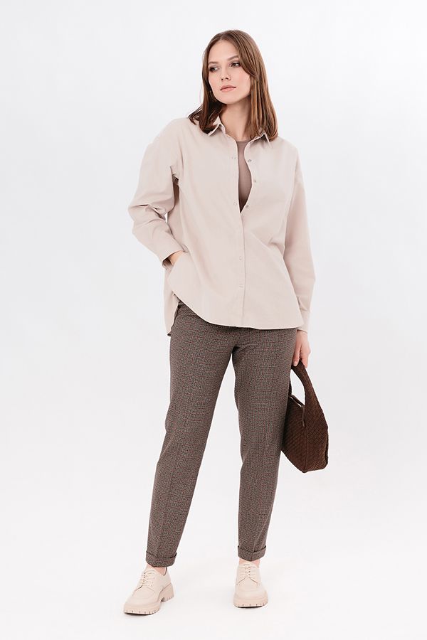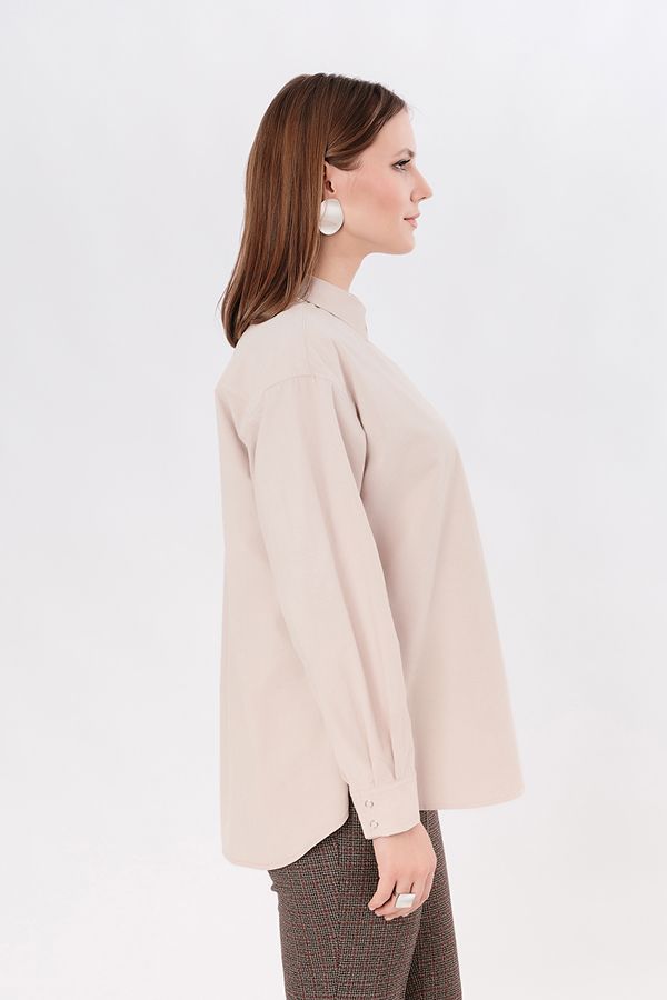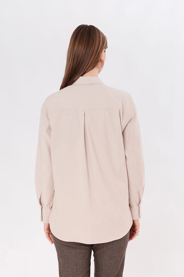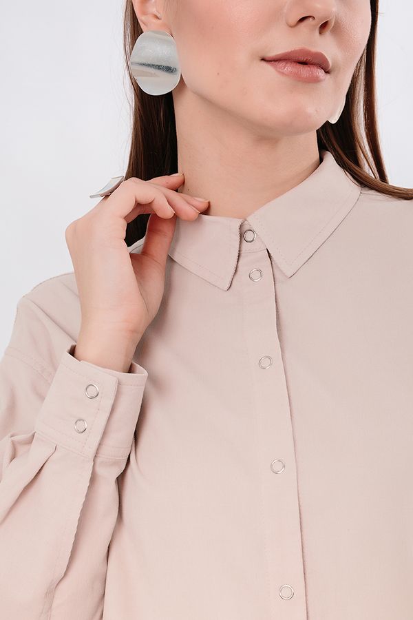 Классическая рубашка свободного силуэта из рубашечного микровельвета. Застежка на кнопки, по спинке кокетка. В боковых швах разрезы. Длина по спинке 73,5 см. Размер модели на фото: 44.  Параметры модели: 90-64-97. Рост модели на фото: 175 см.